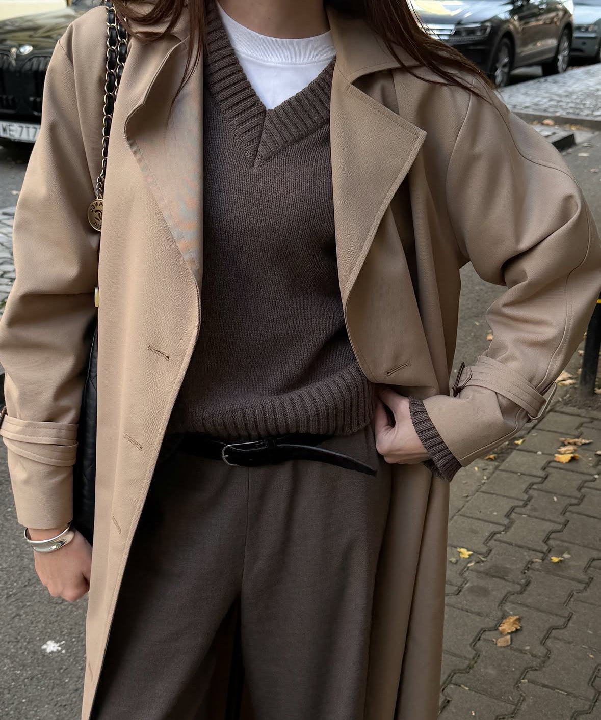 Elise is wearing Le Saturnin trench coat in Chocolate