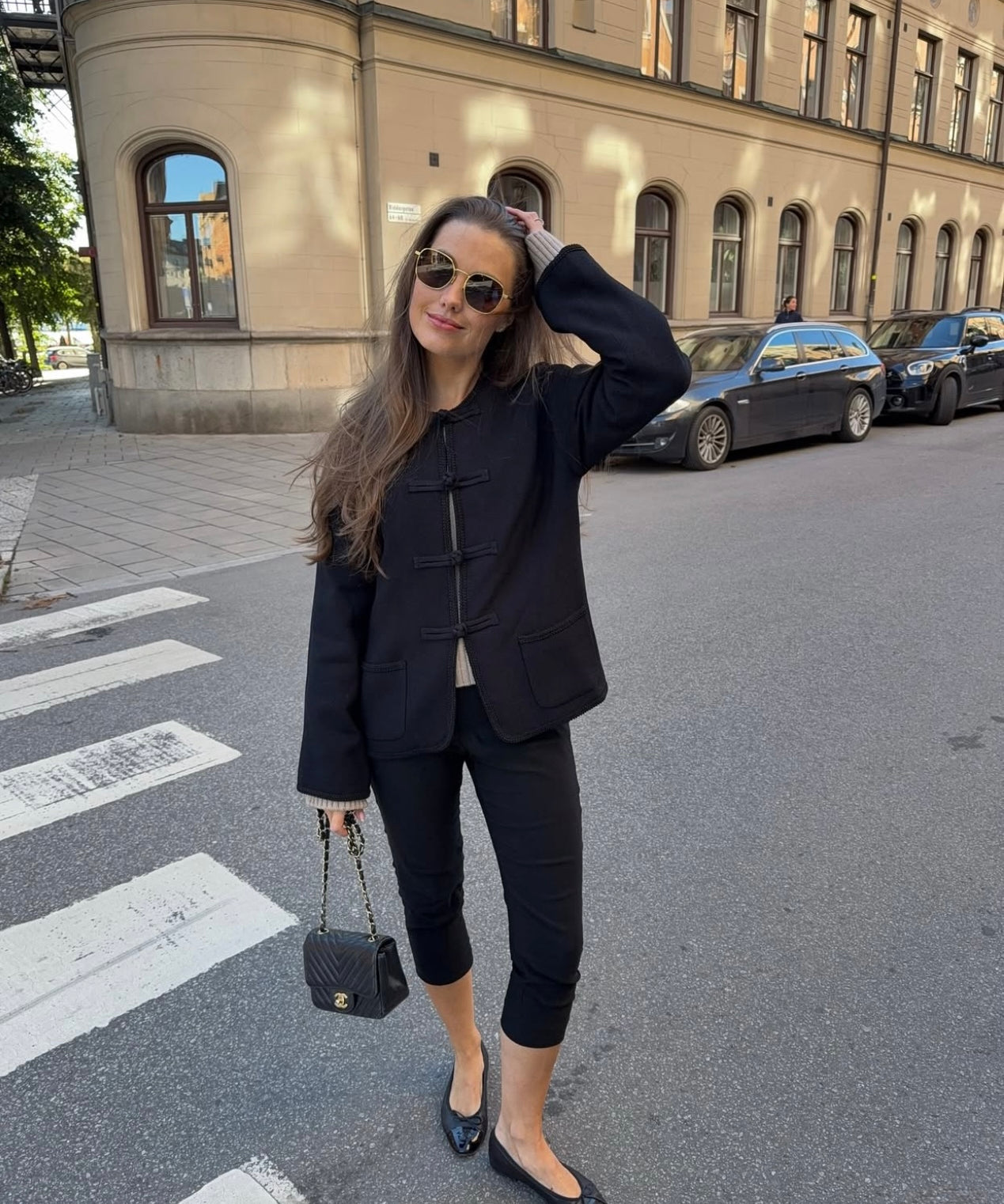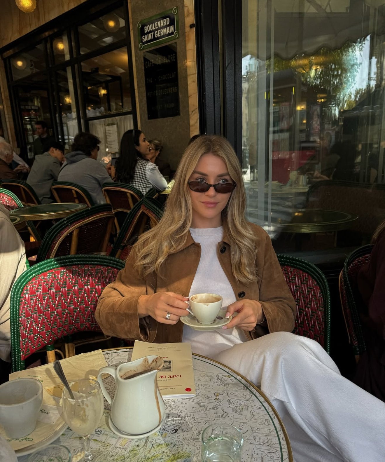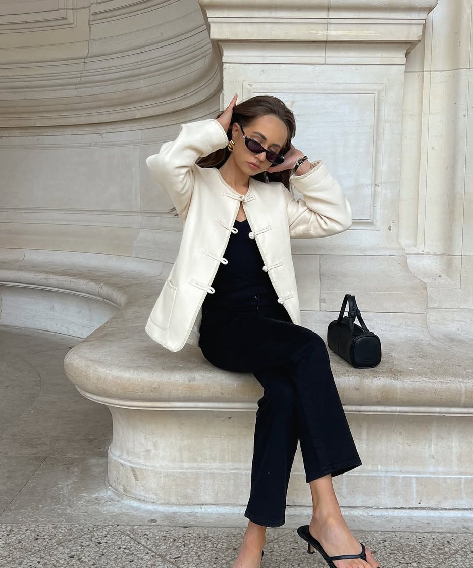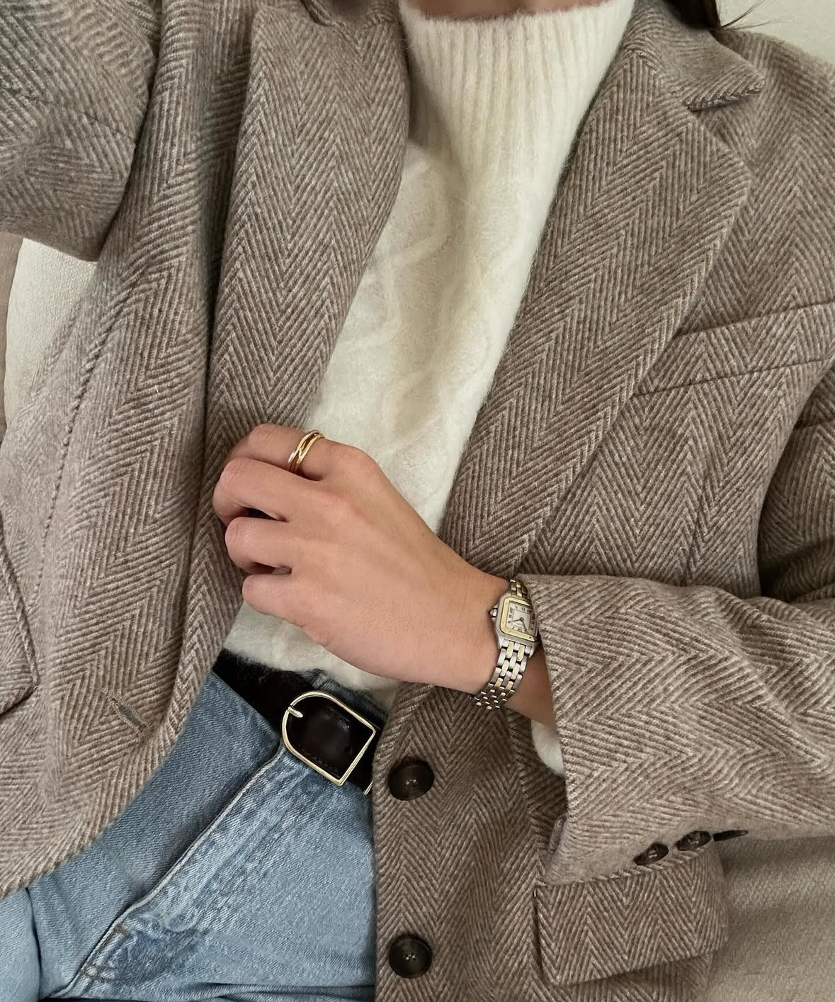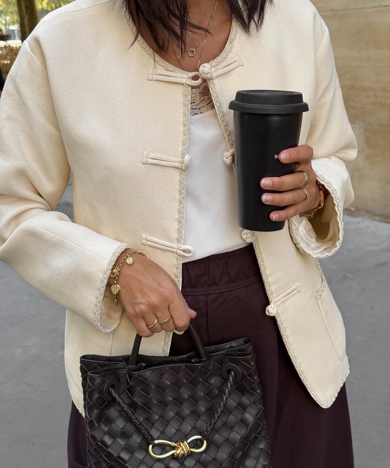 Jenna is wearing Le Thibaud jacket in Biscotti