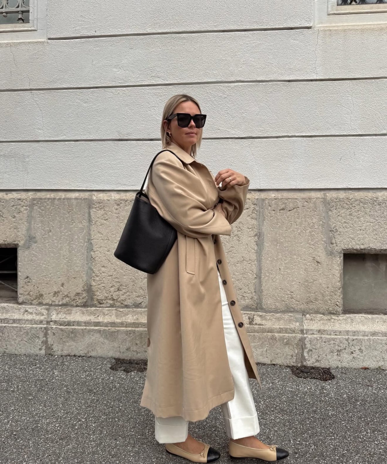 Stefany is wearing Le Saturnin trench coat in Croissant