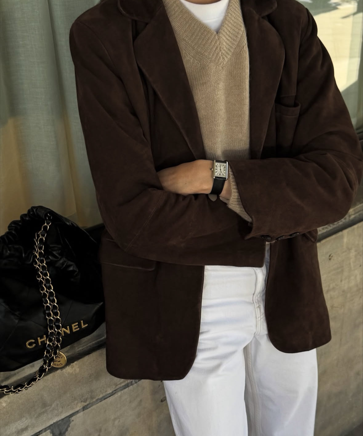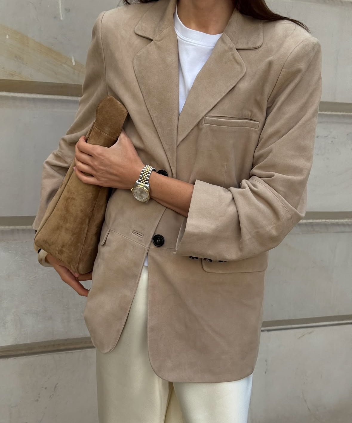 Irin is wearing Le Thibaud jacket in Shortbread Suede Leather