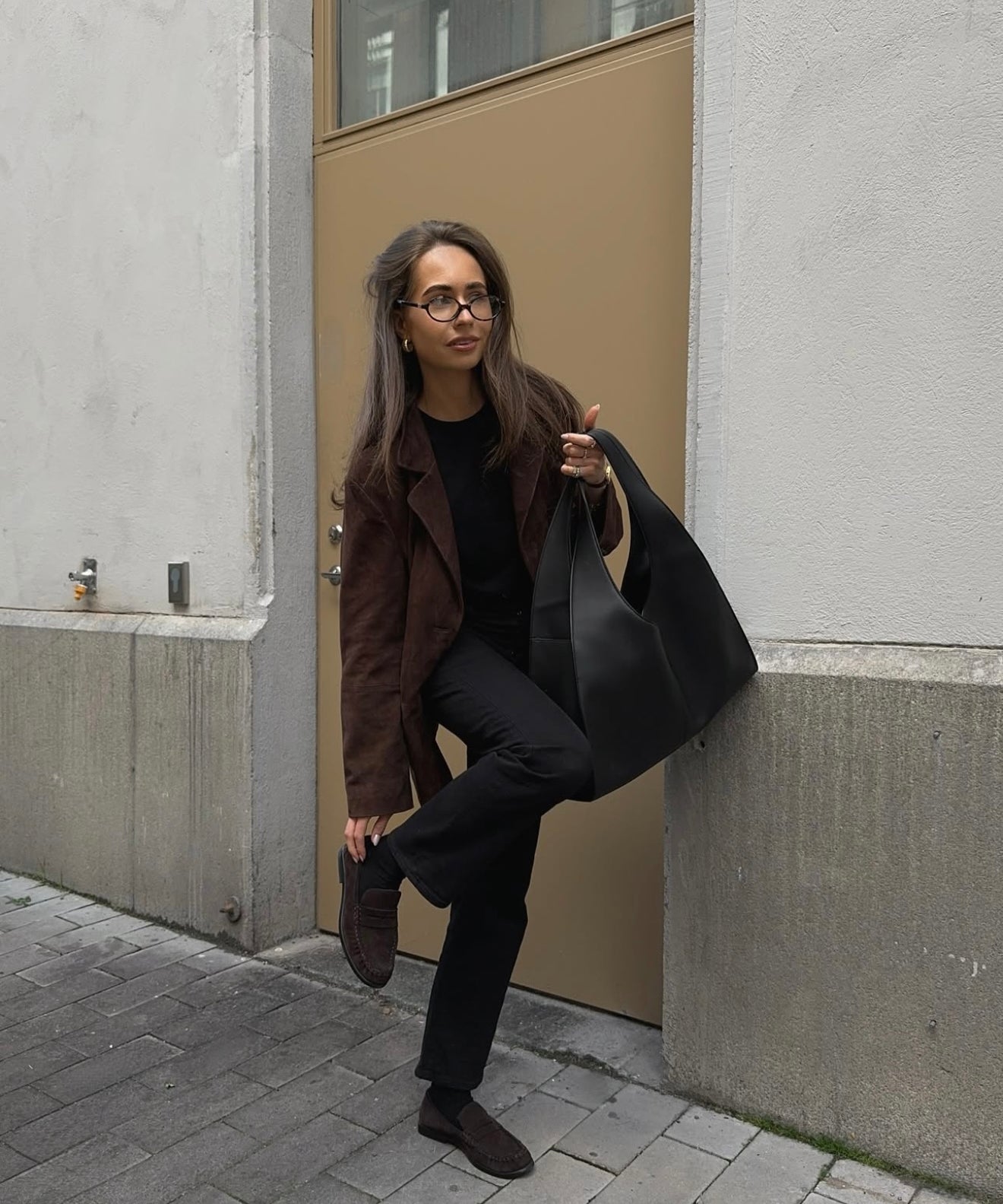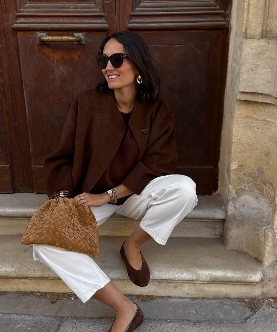 Lily is wearing Les Fleury flats in Chocolate Suede Leather