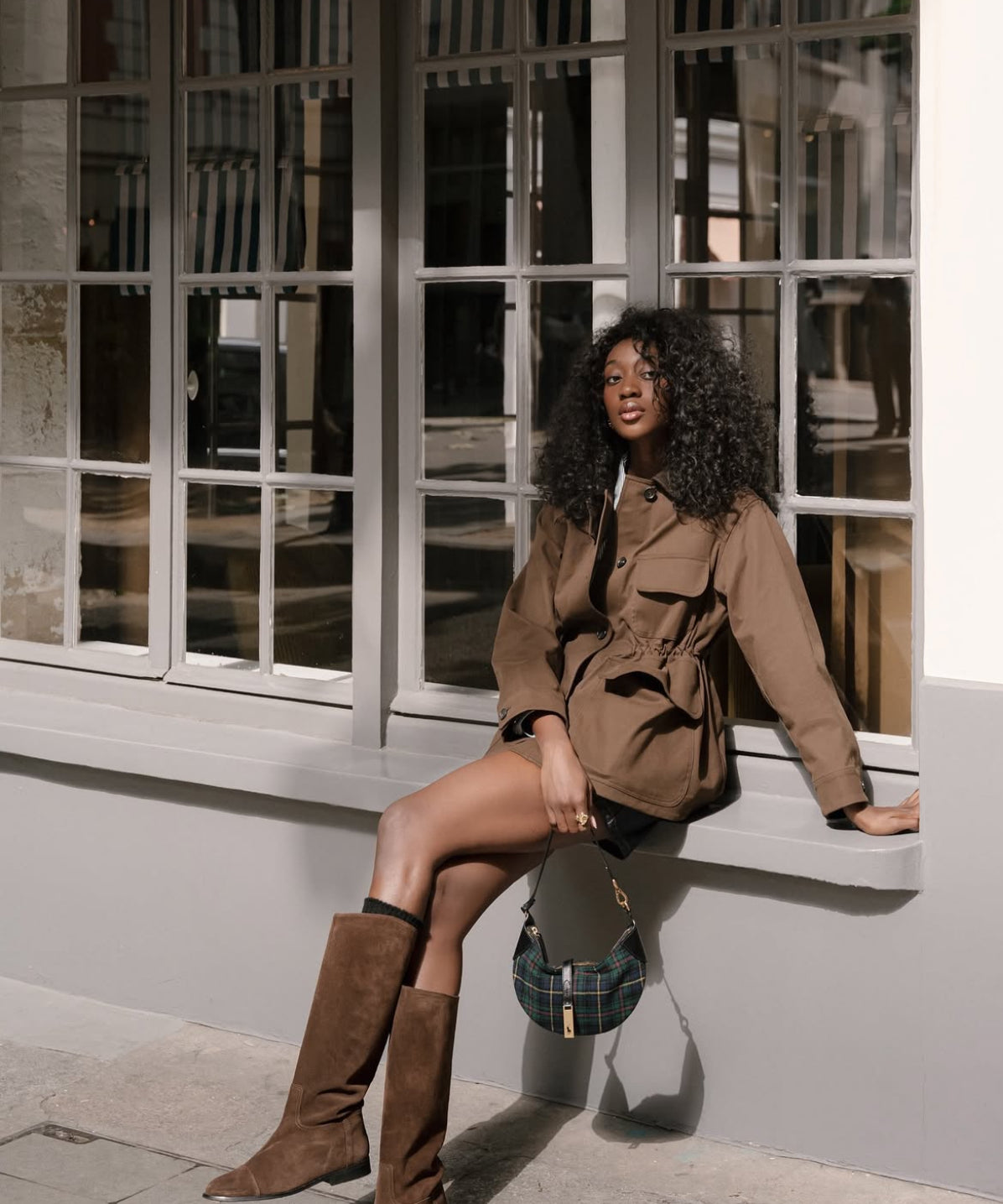 Charlène is wearing Le Joyce trench-coat in Chocolate Suede