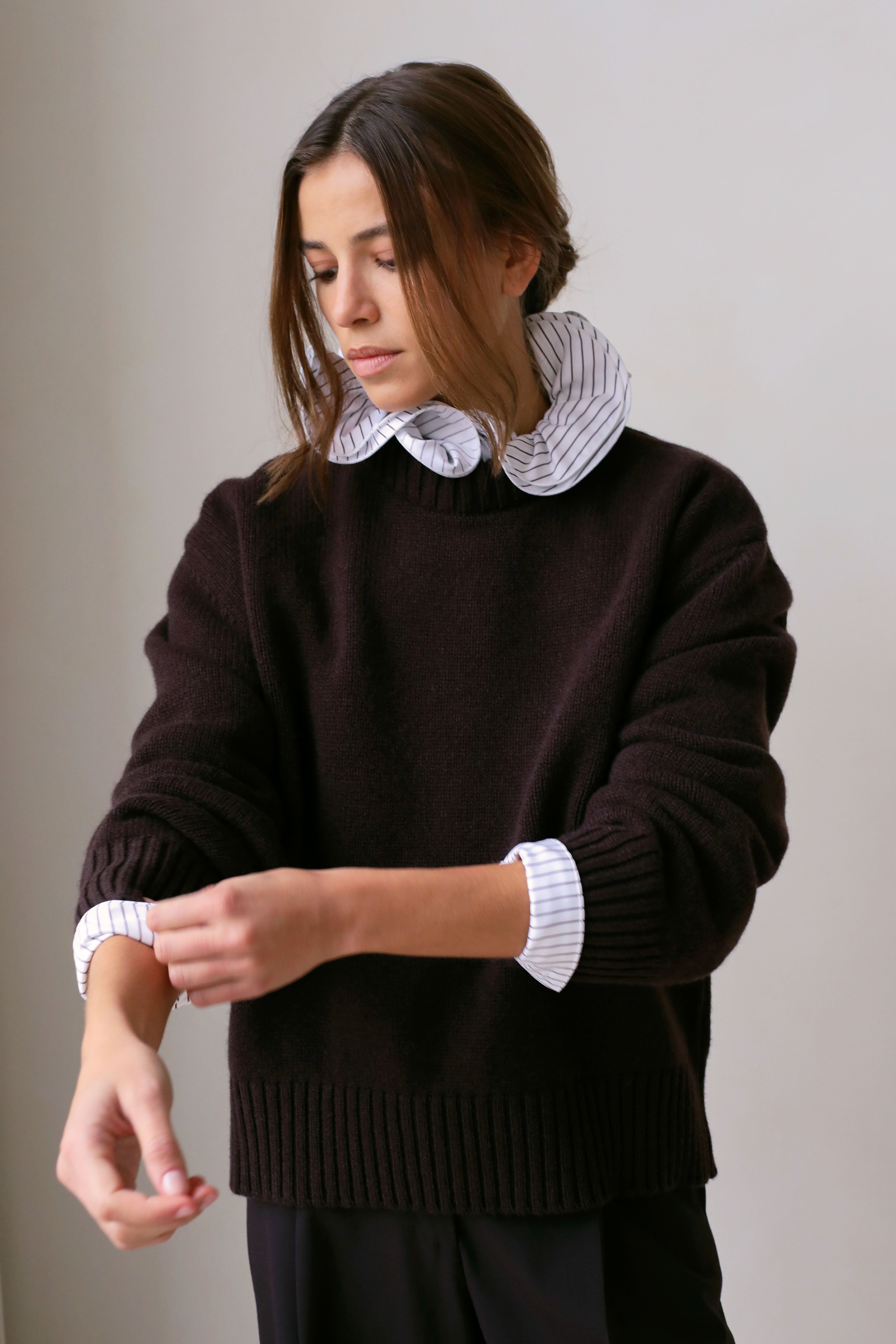 As much as we love our oversized sweaters, we were looking for a more fitted, structured piece. Because every wardrobe deserves the perfect crewneck, Le Chopin was designed to fill that gap, seamlessly combining cozy, timelessness and chic. Knitted from our signature incredibly soft cashmere and merino yarn, Le Chopin features a slightly loose fit, cropped silhouette, and wide ribbed trims, making it the ideal choice to layer under coats and jackets and easy to style from casual day-to-day wear to a more refined look. In a few words, Le Chopin will soon become a cherished wardrobe staple, infusing everyday wear with a subtle elegance.