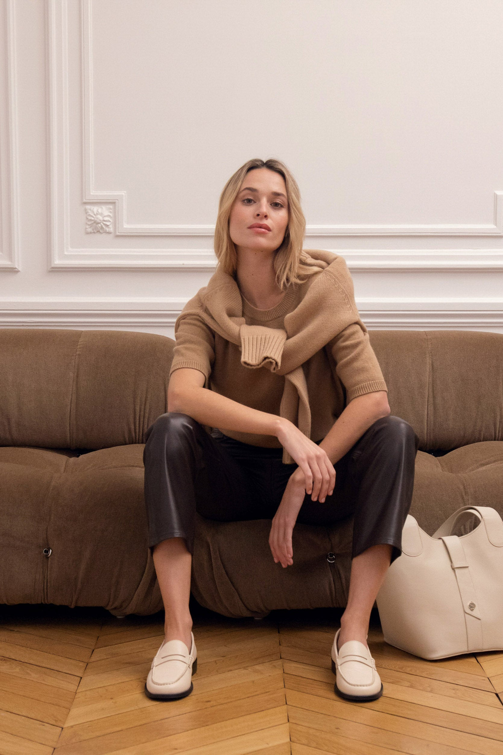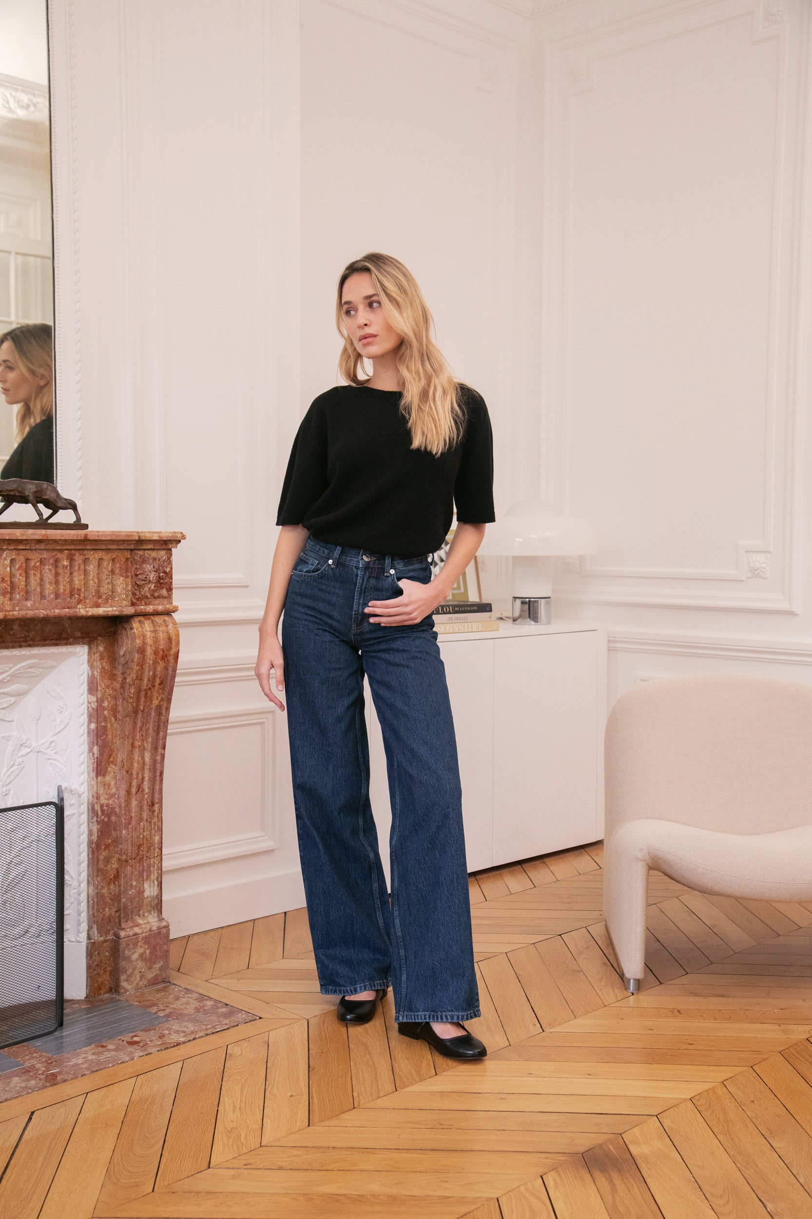 Marion, our dark blond, is 1,70m tall. Her usual size is a 34/36 and she’s wearing a size 1.