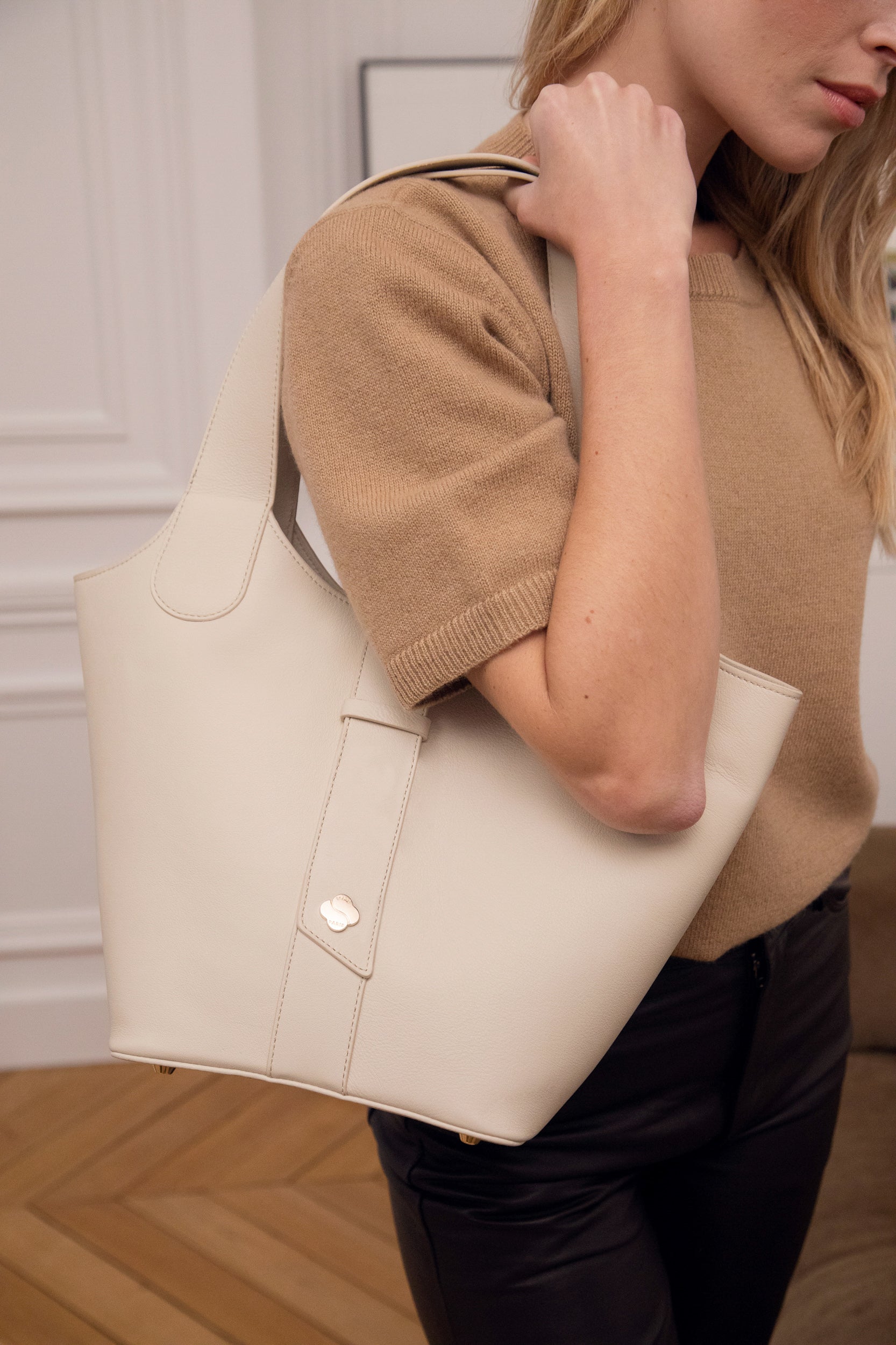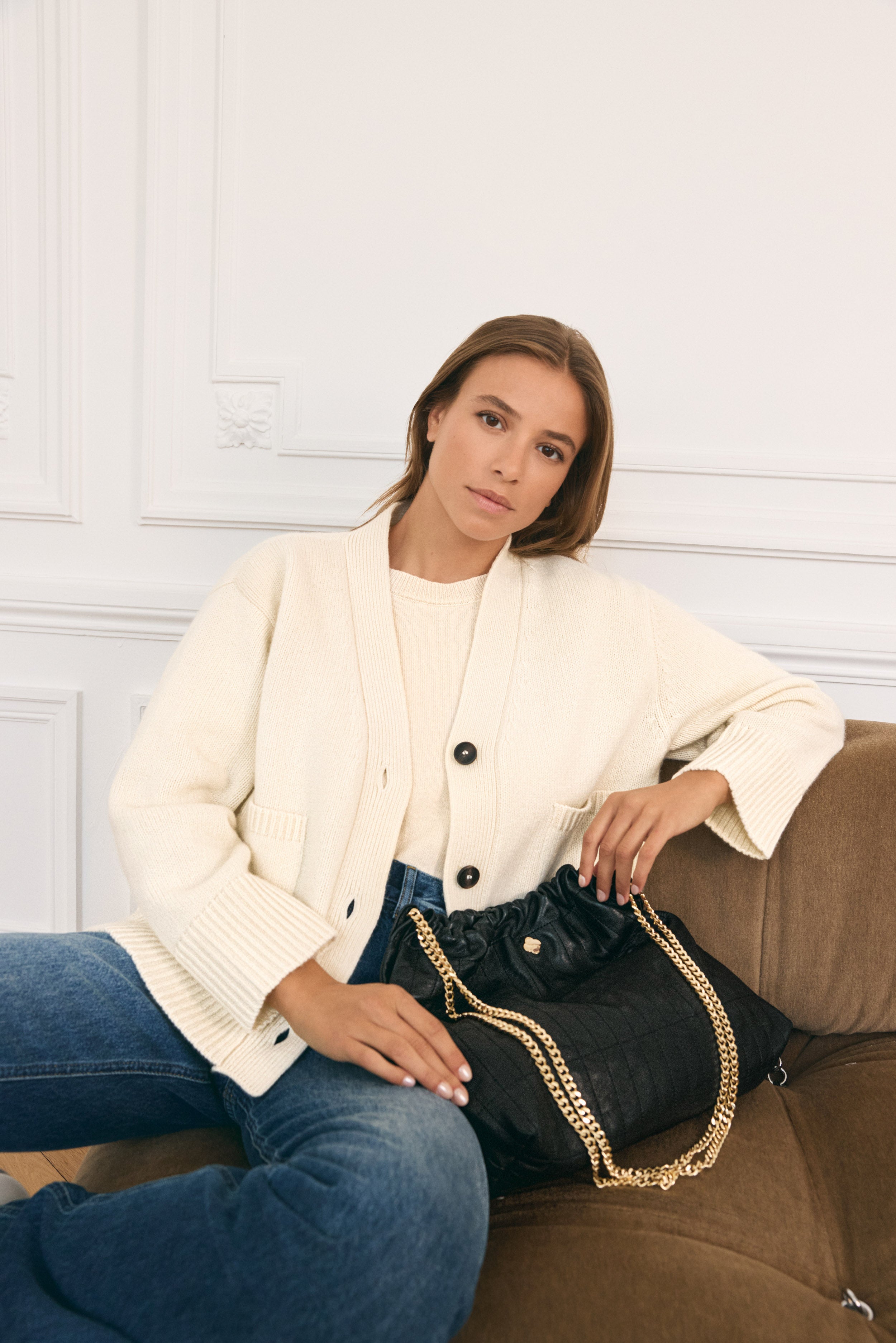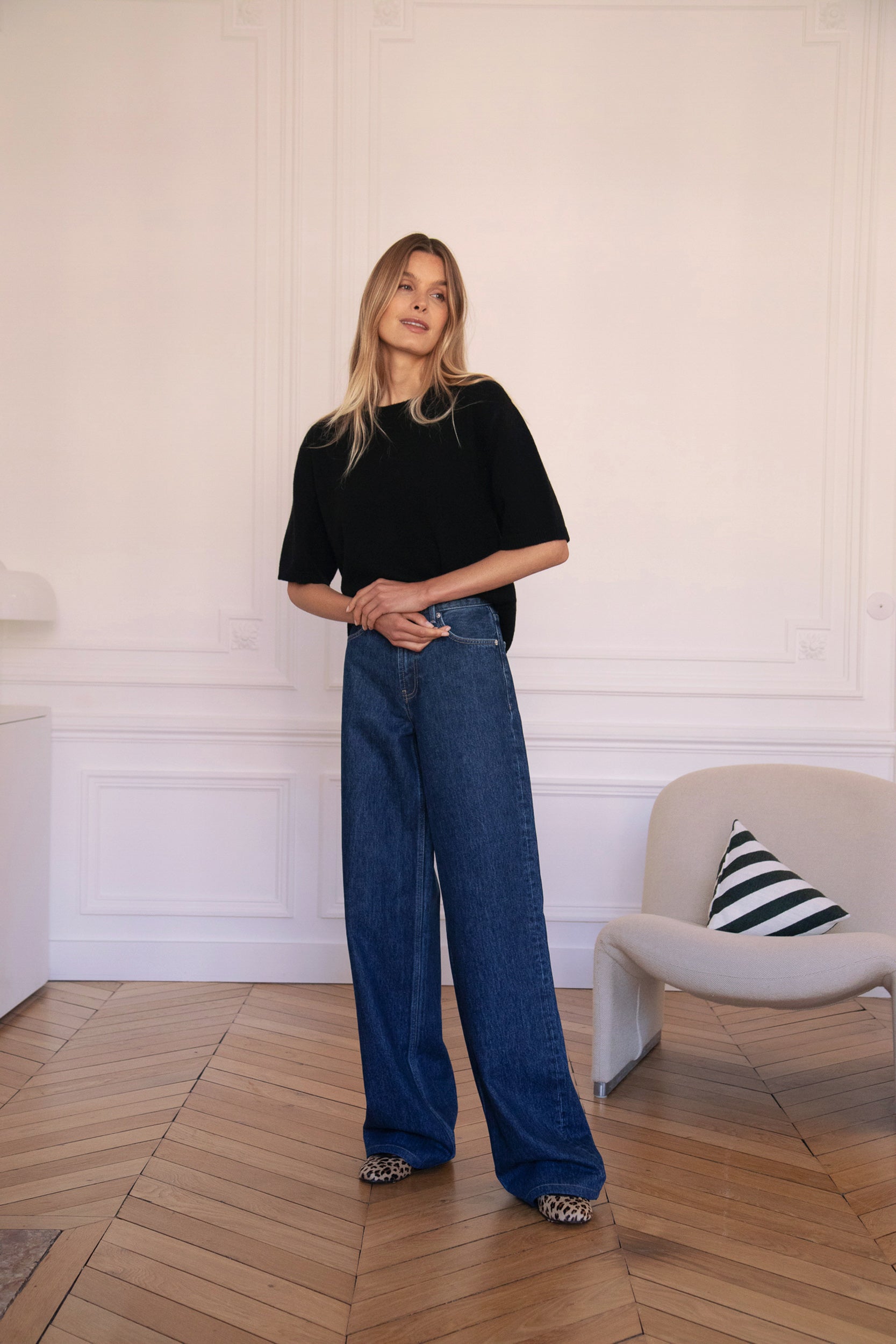 Celine, our brunette, is 1,73m tall. Her usual size is a 36 and she’s wearing a size 1.
