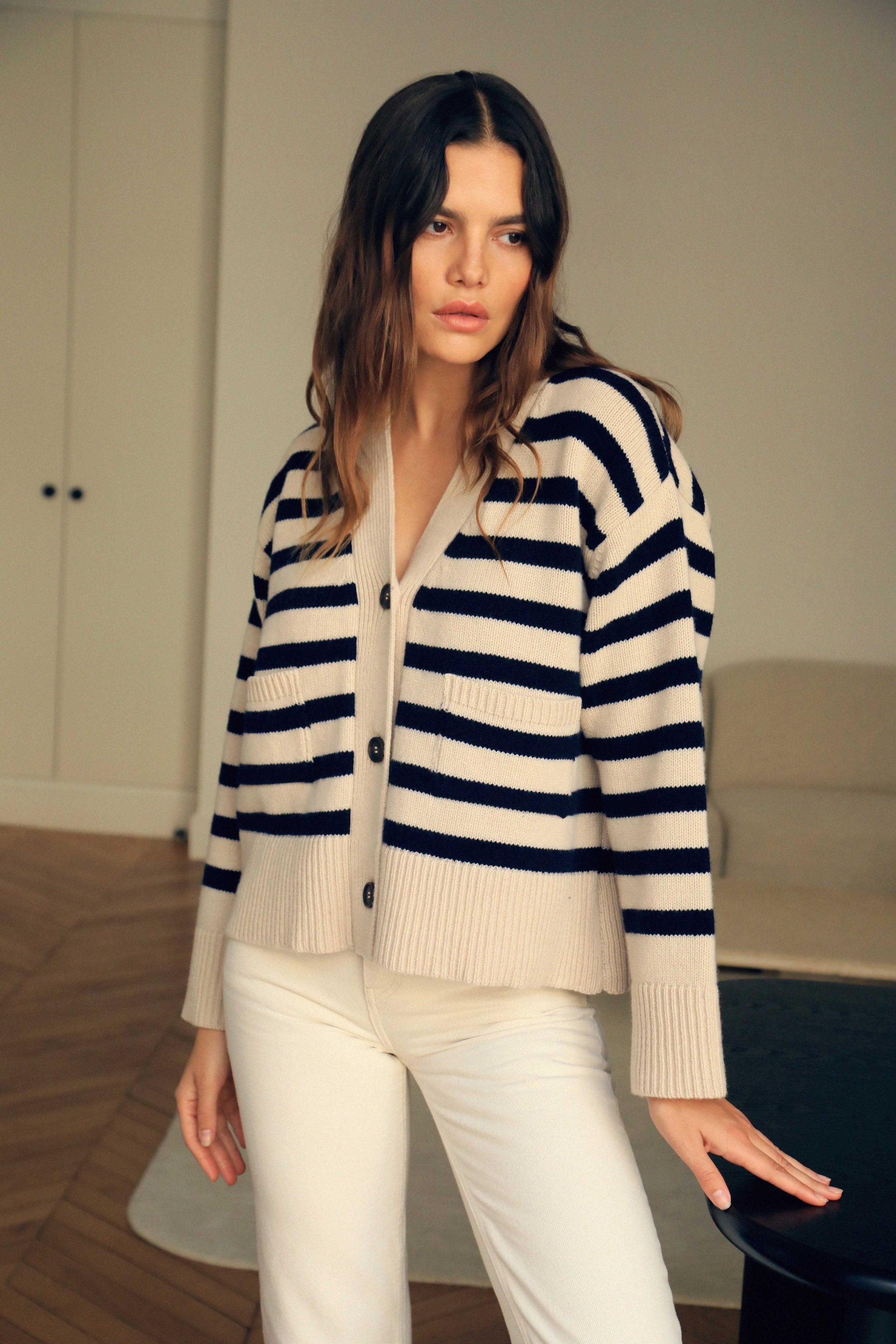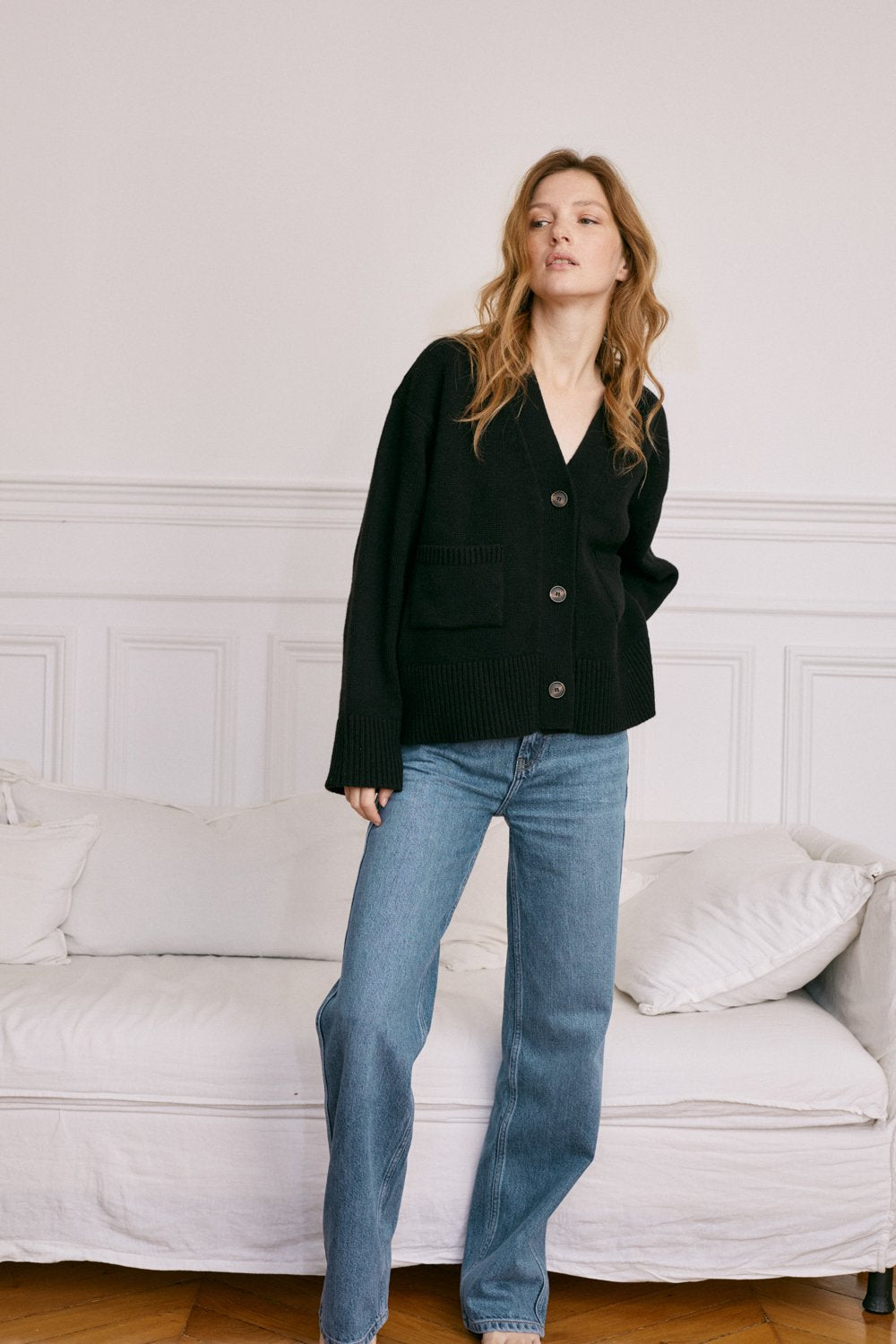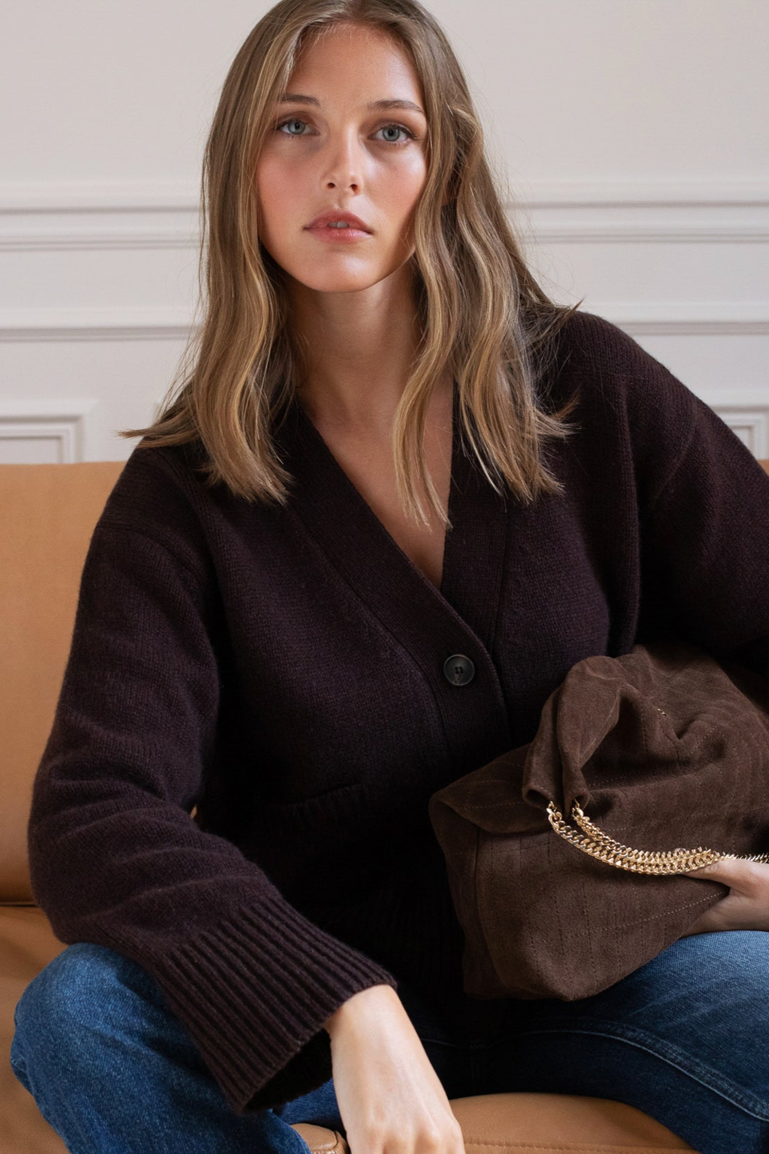Playing with the idea of a seasonless wardrobe and designed with a timeless touch, Le Niklaus will soon become an essential of your dressing. Knitted from our signature cashmere and merino wool yarn, Le Niklaus has a short slightly cropped boxy silhouette that falls loosely on the body for that oversized fit we all love. With its v-shaped neckline, dropped shoulders, brown buttons and little patch pockets in front, Le Niklaus cardigan is the ultimate minimalist cardigan you need for all your favorite outfits.
