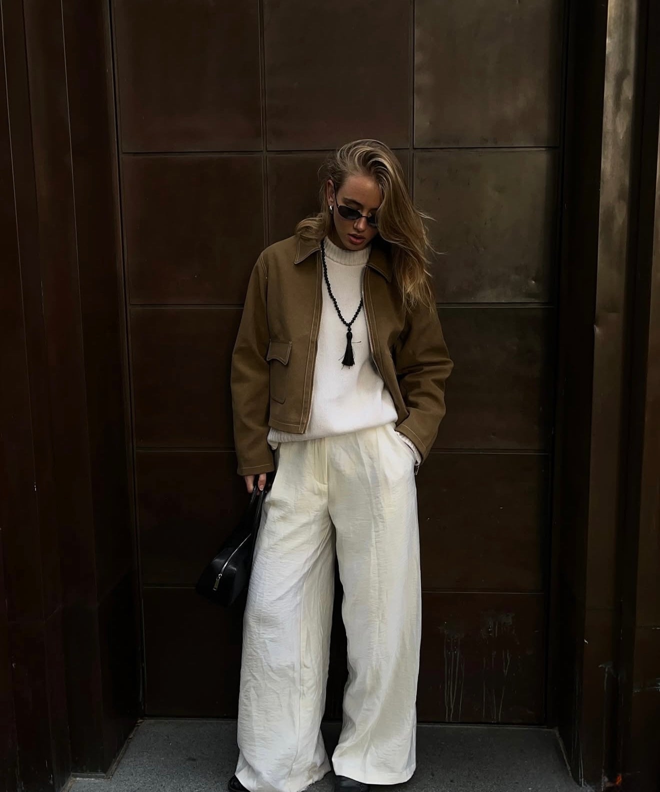 Jenna porte la veste Le Thibaud en Chevrons Biscotti
