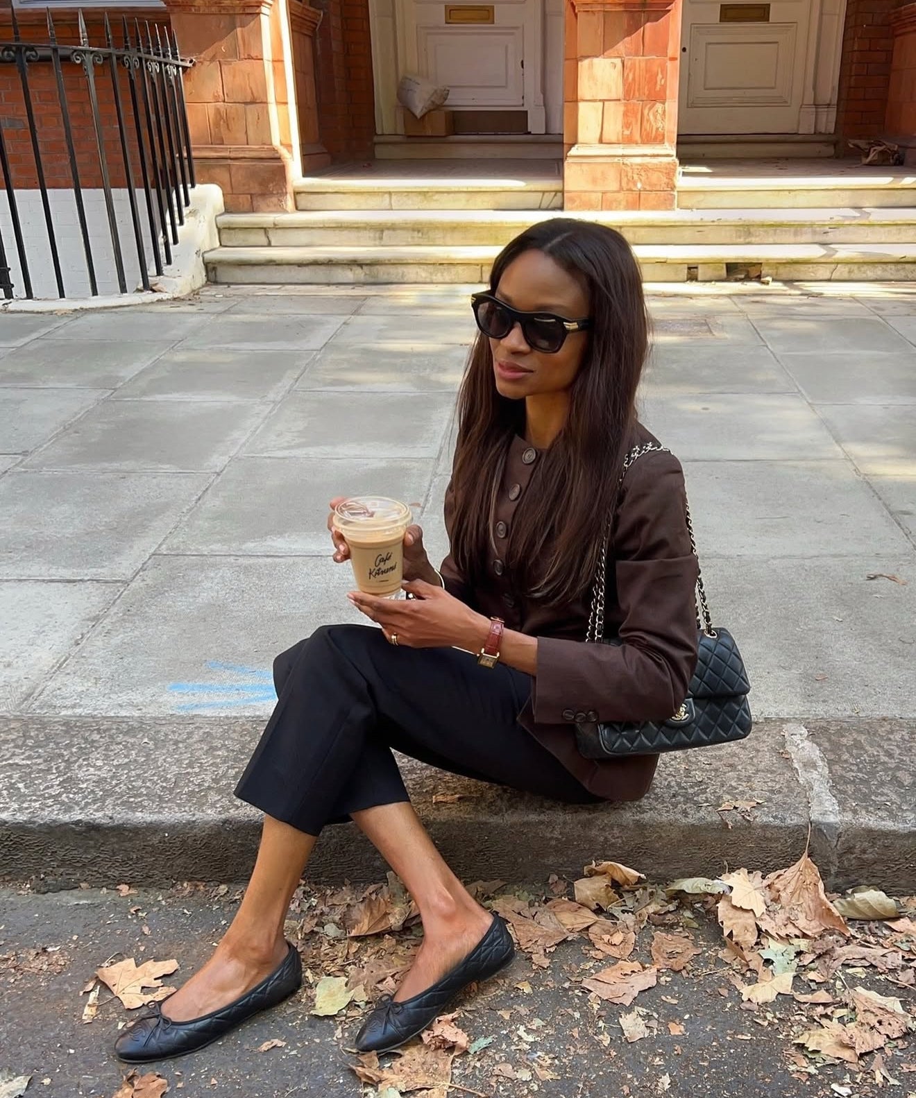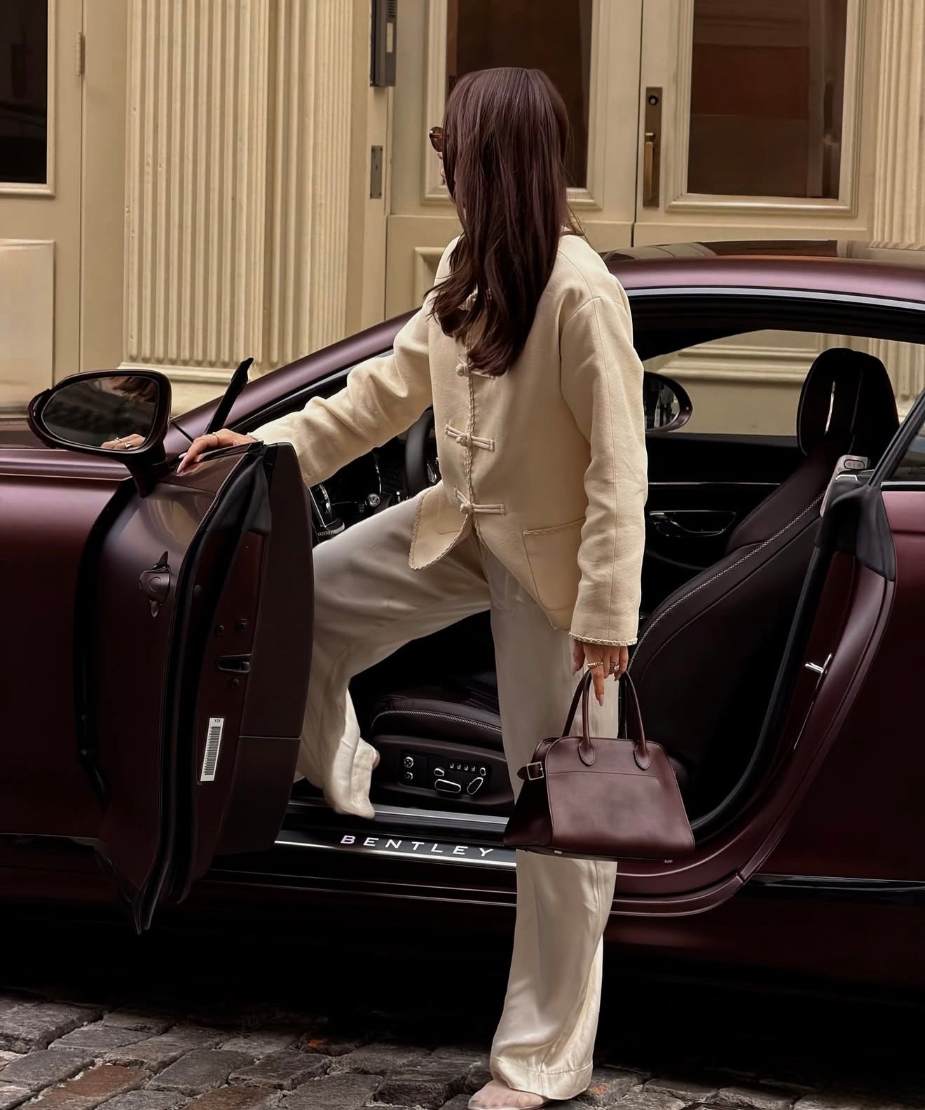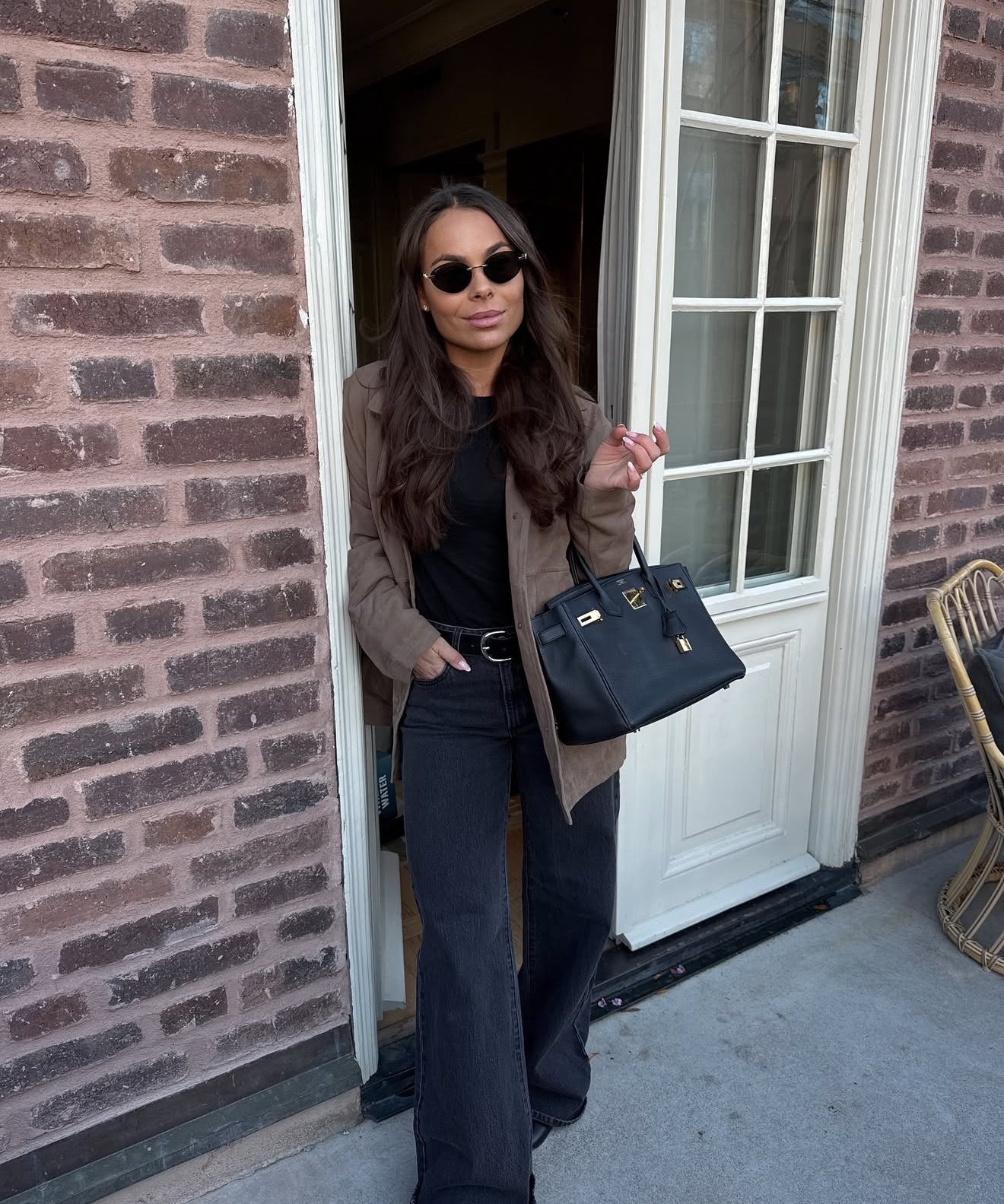 Julie porte la ceinture Le Fellini & le sac Le Chenonceau en Cuir Réglisse