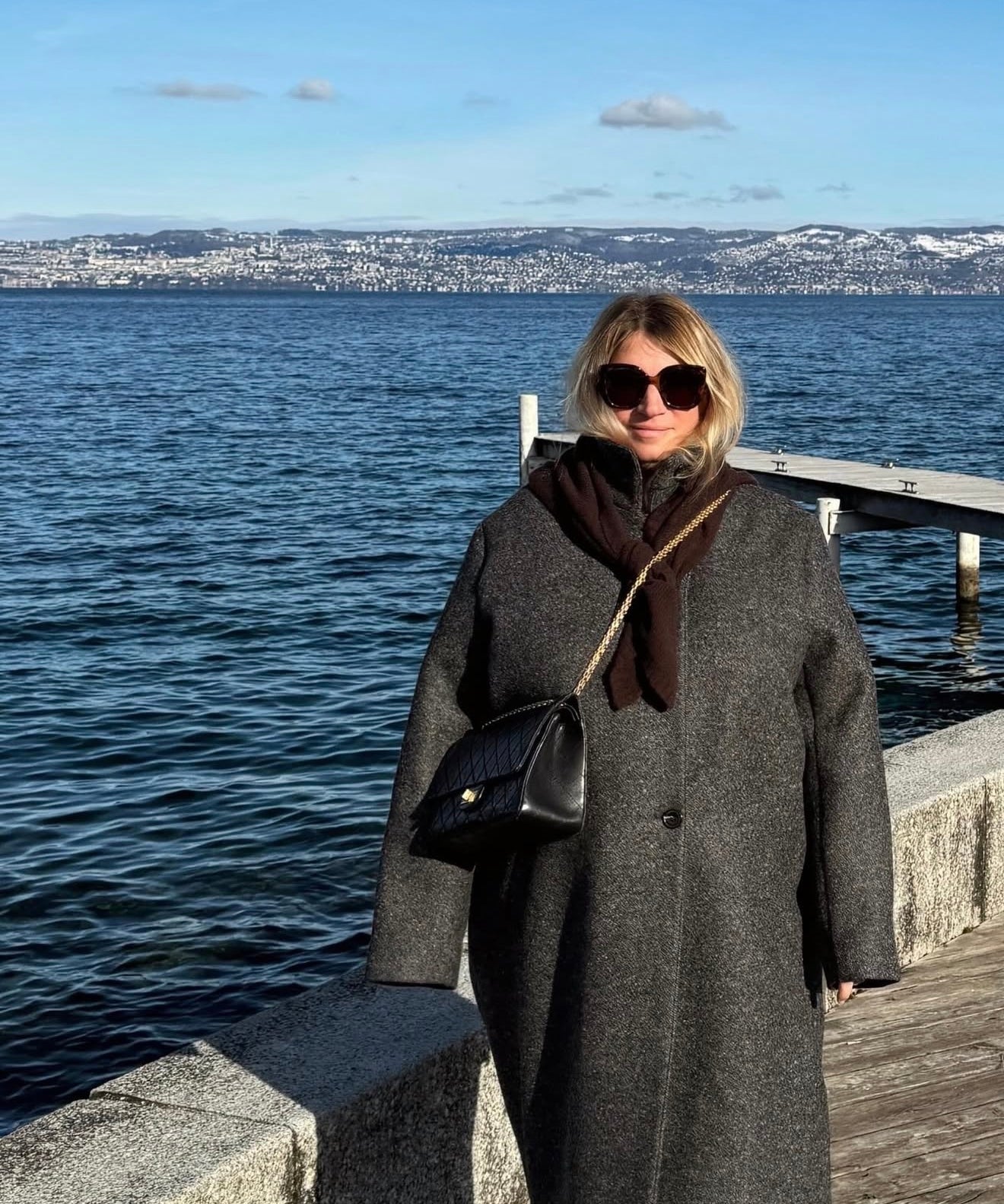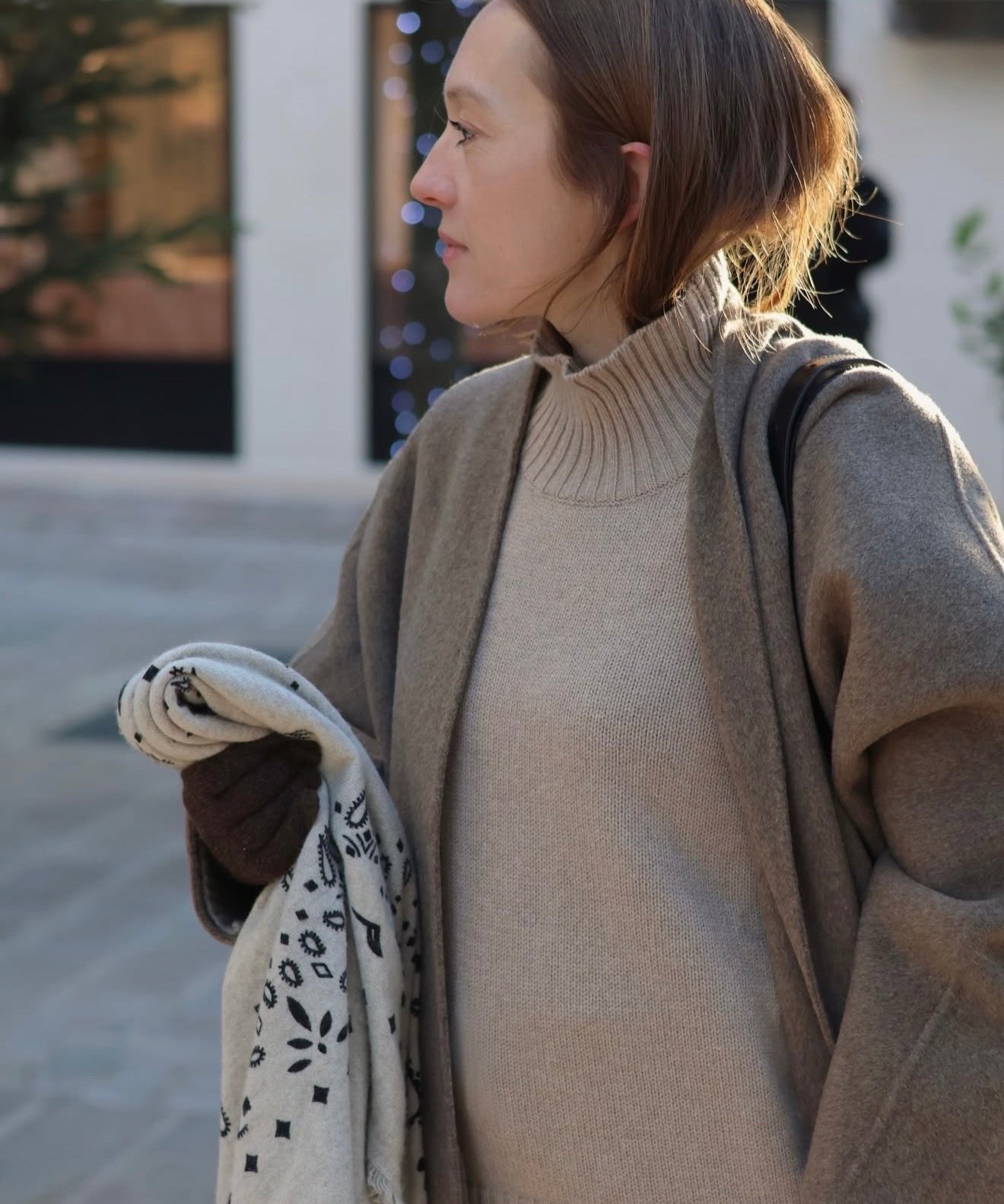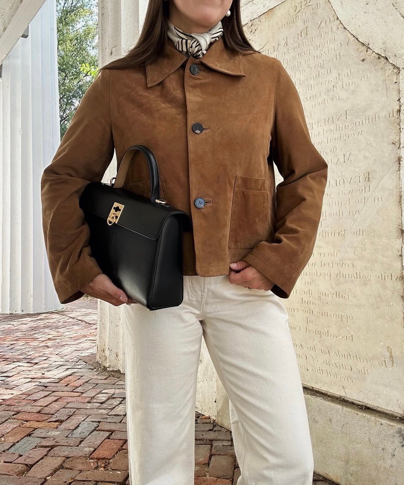 Julie porte le sac Le Chenonceau en Cuir Réglisse & le carré en soie Le Louis en Réglisse