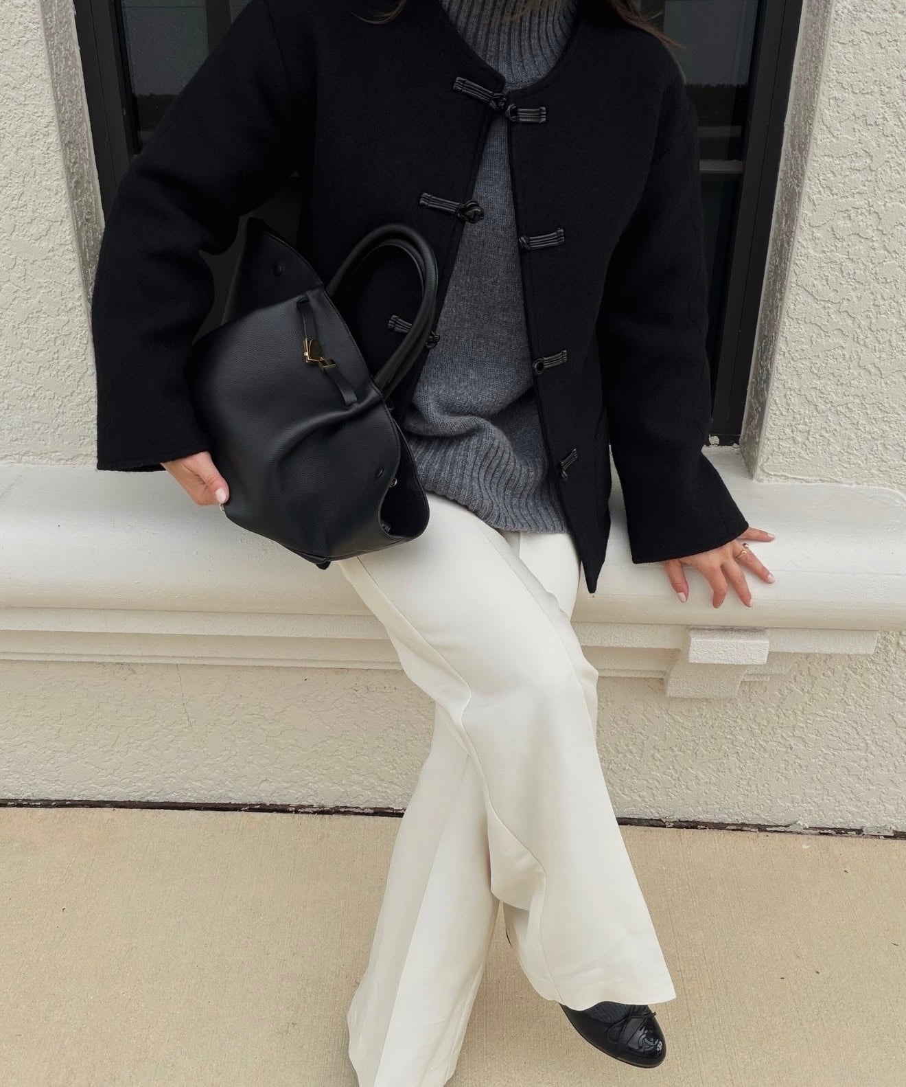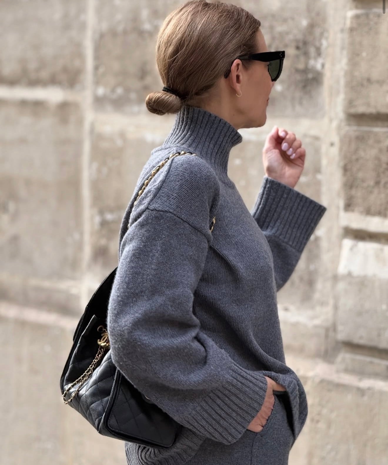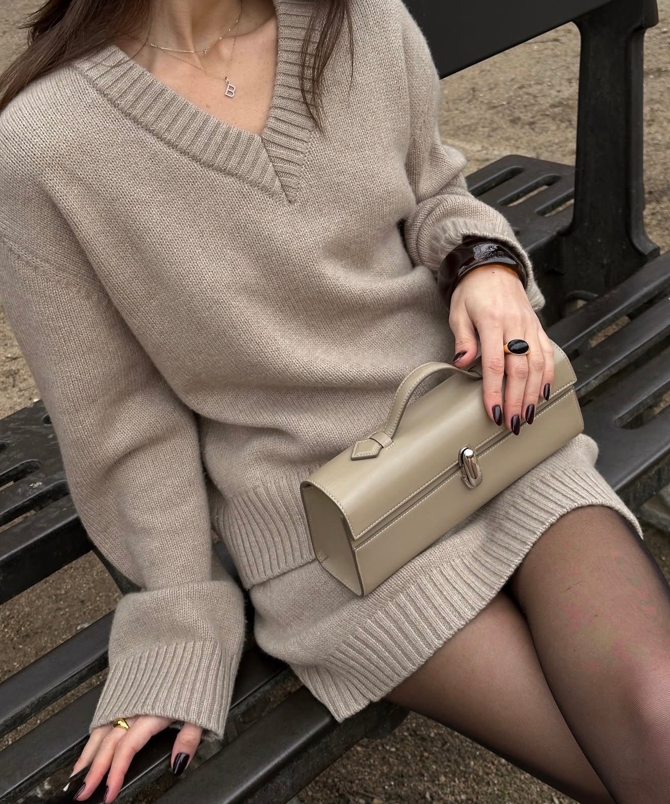 Julie porte le sac Le Chenonceau en Cuir Réglisse & le carré en soie Le Louis en Réglisse