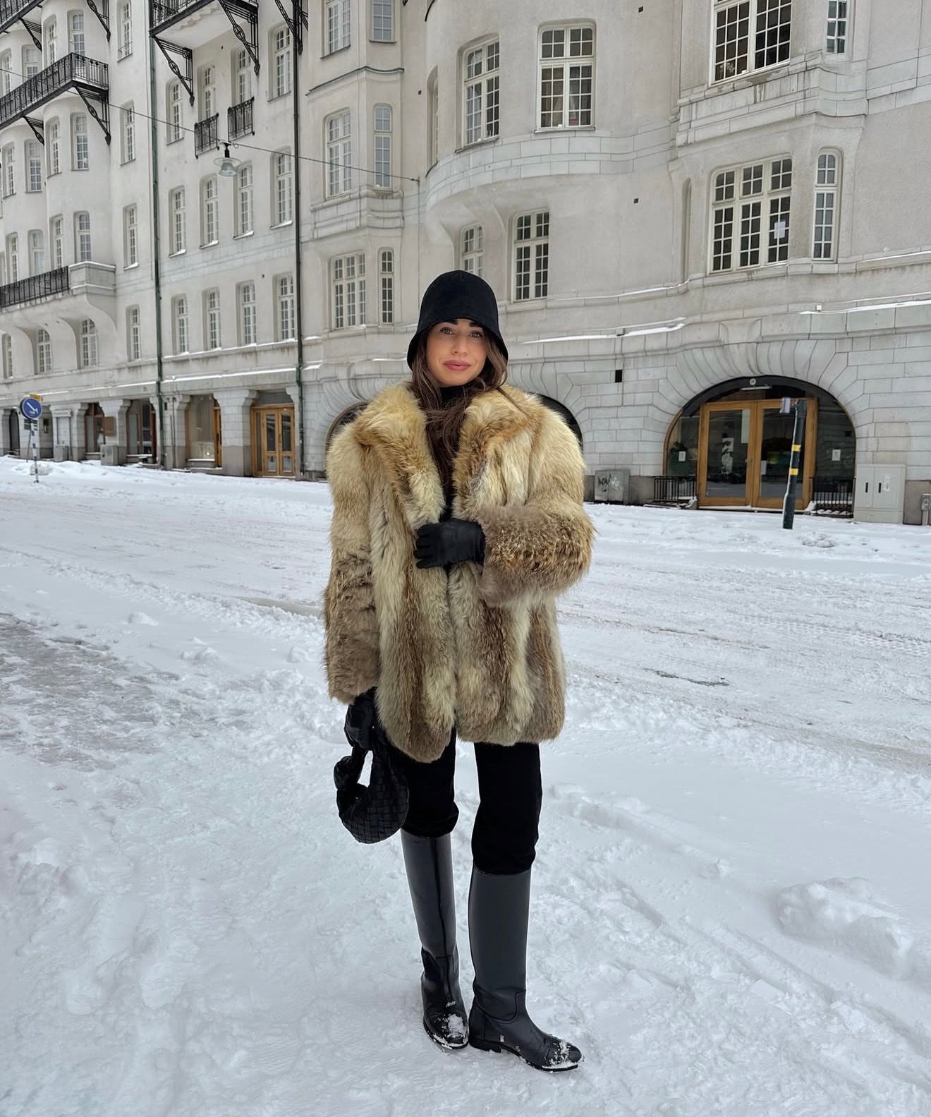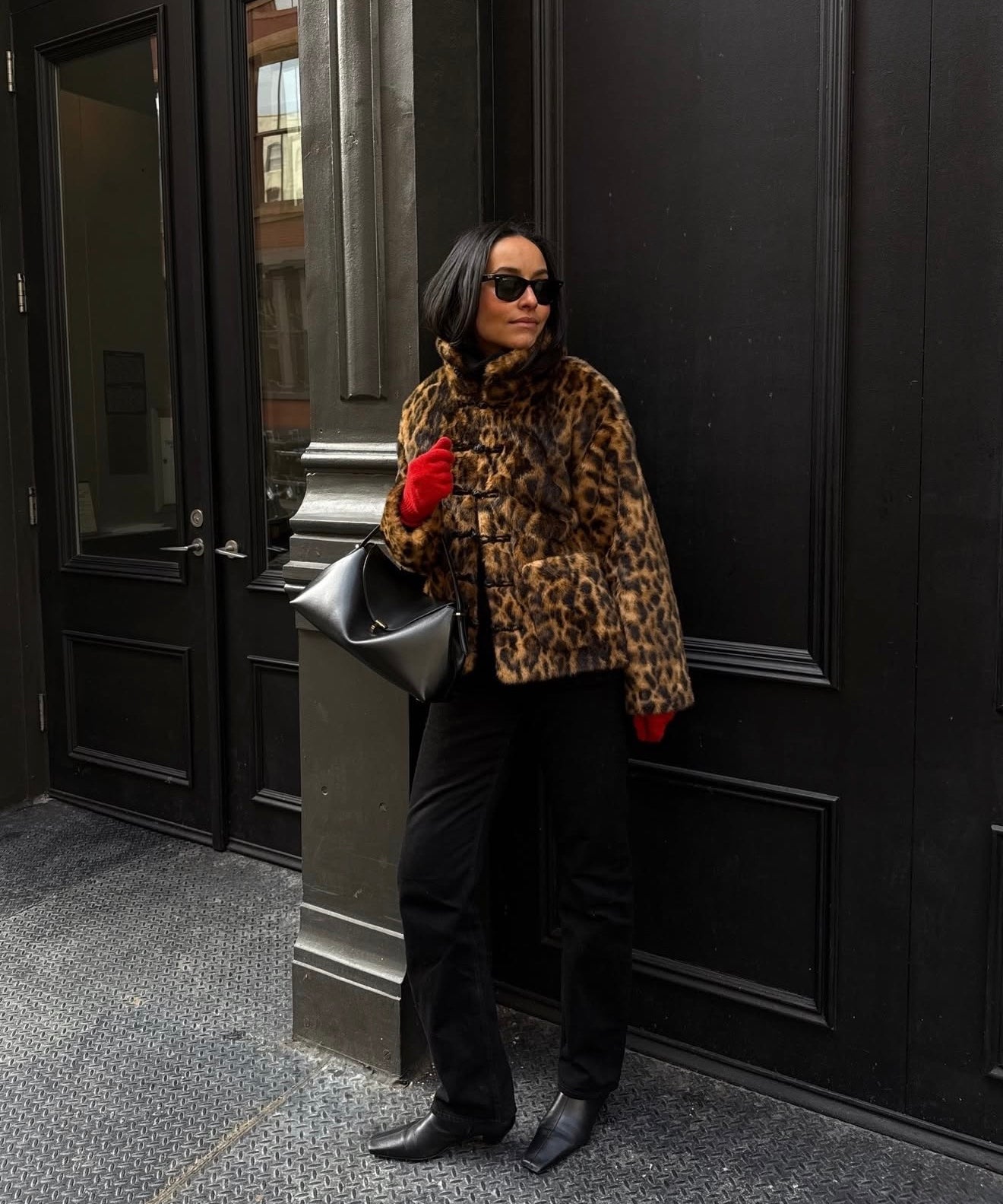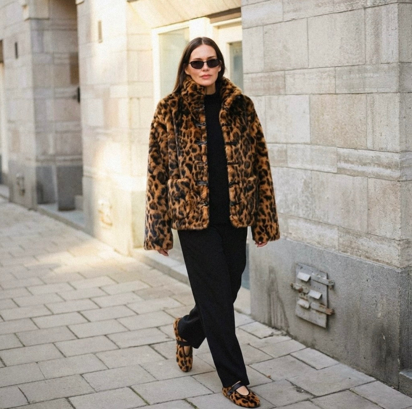 Caroline porte le manteau Le Verdi & les mary-janes Les Jarry en Fausse Fourrure Léopard
