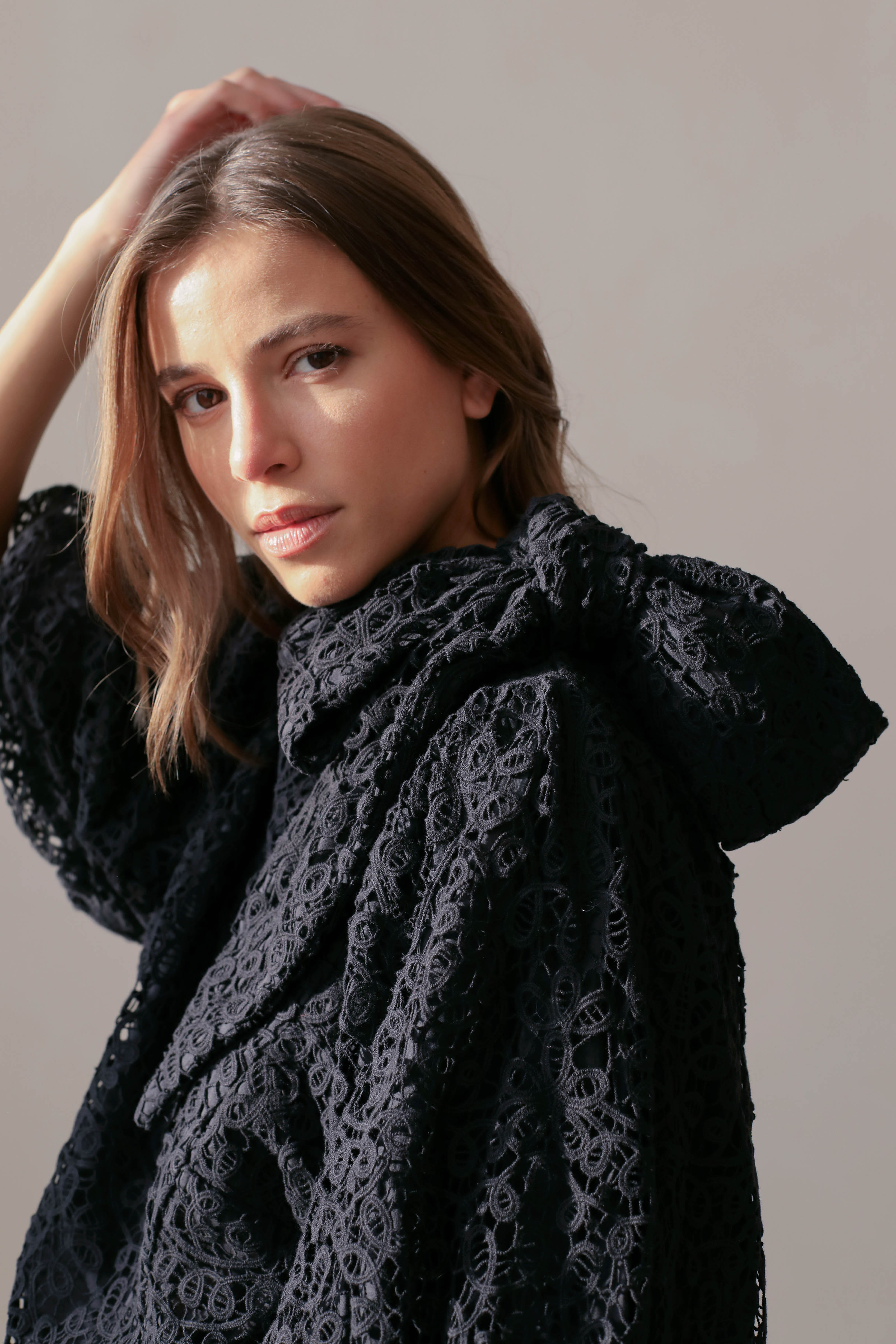 Notre organza de soie et notre guipure marine sont upcyclés à partir de nos rouleaux de tissus restants (provenant à l'origine de Nona Source, la plateforme soutenue par LVMH qui revalorise les matériaux restants des Maisons les plus renommées).