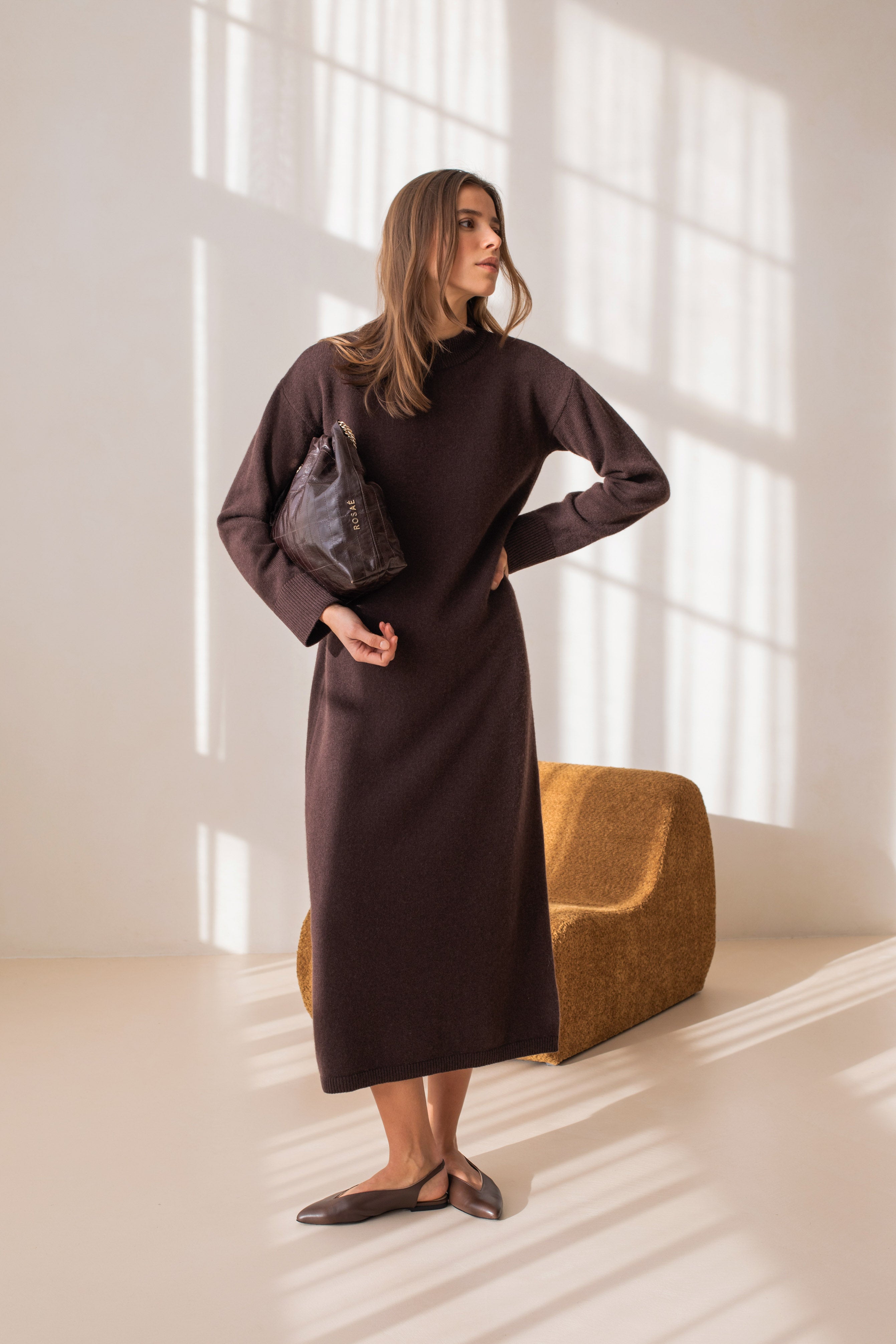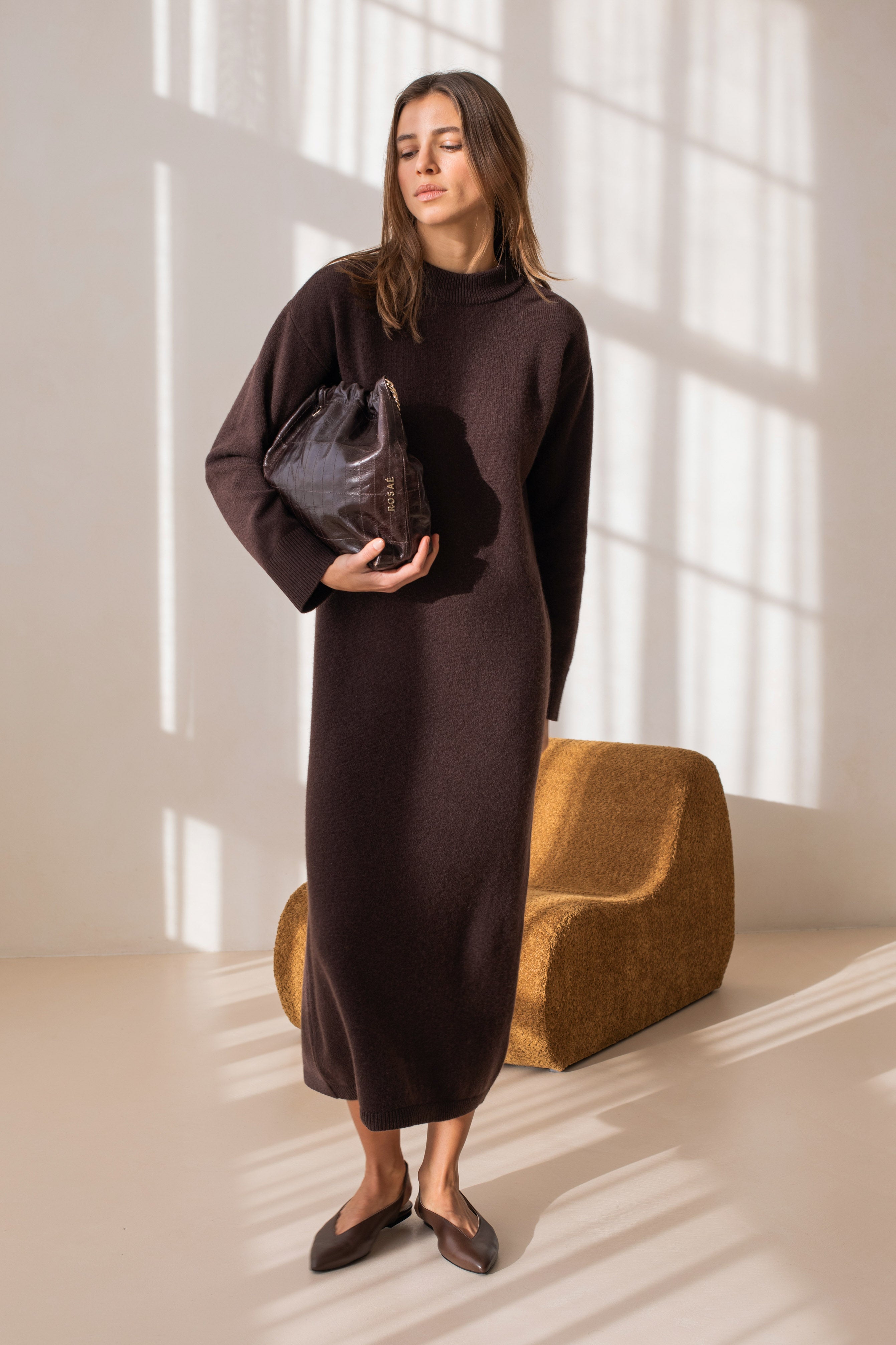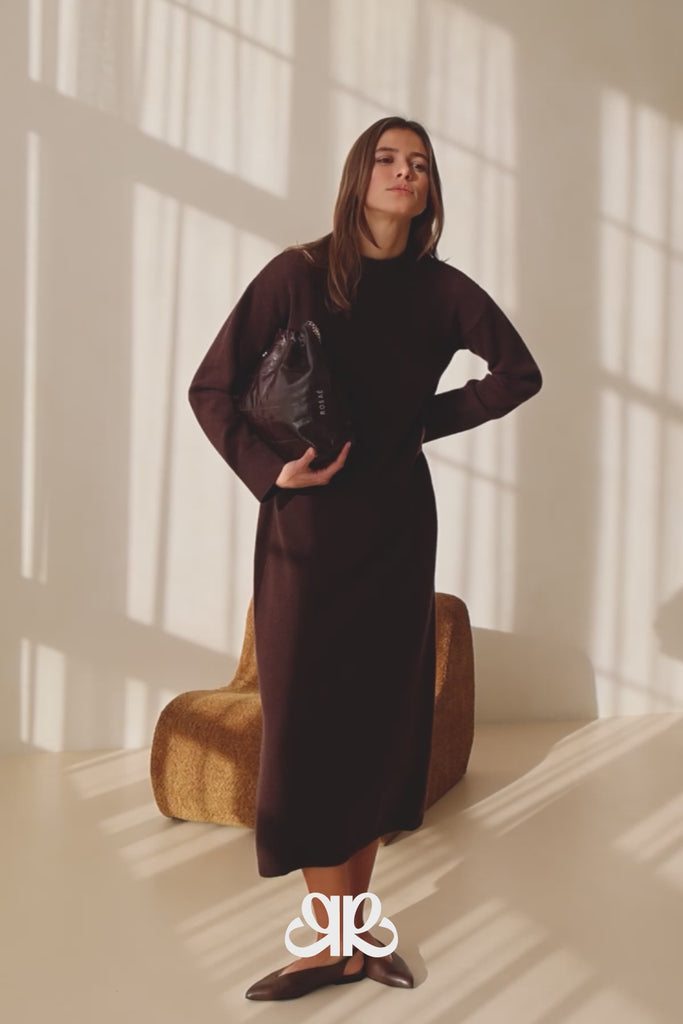 Lignes épurées, allure essentielle. Le Gaël, c'est la robe en maille qui incarne l'essence même du chic minimaliste, pensée pour traverser les années avec justesse. Sa longueur cheville dessine une silhouette élancée, tandis que ses manches longues et son col rond signent une esthétique sobre, intemporelle et maîtrisée.