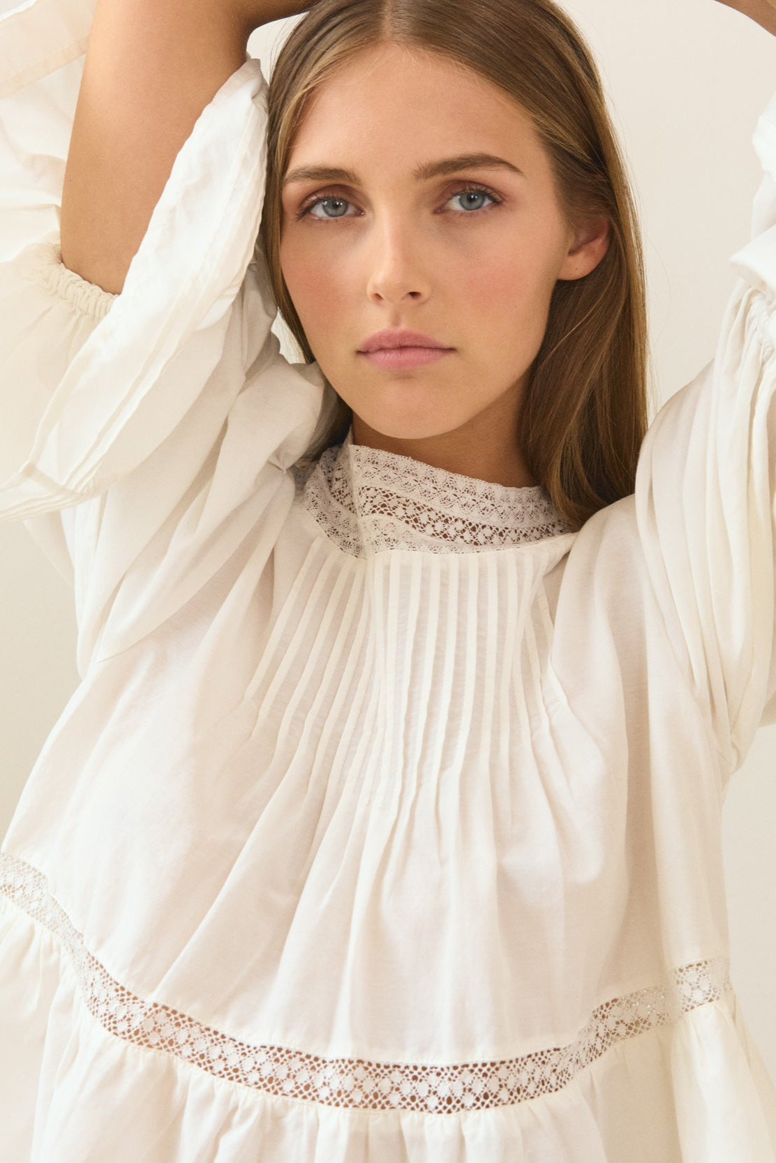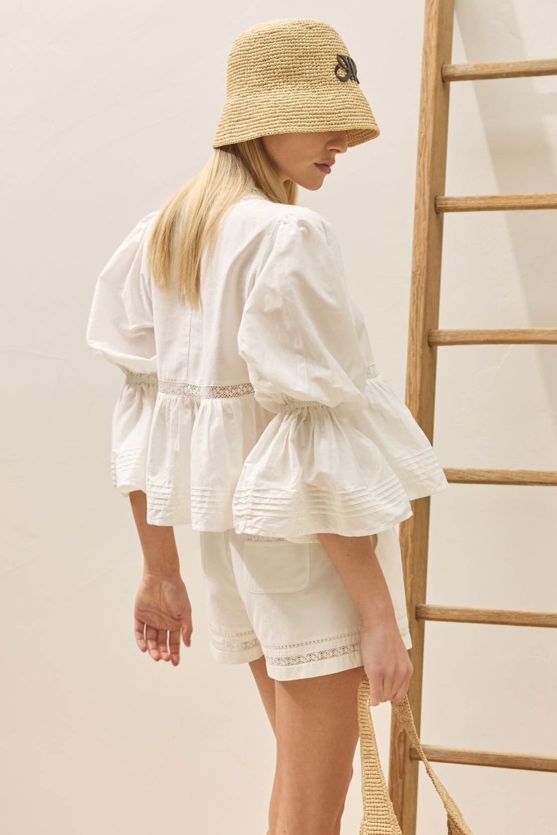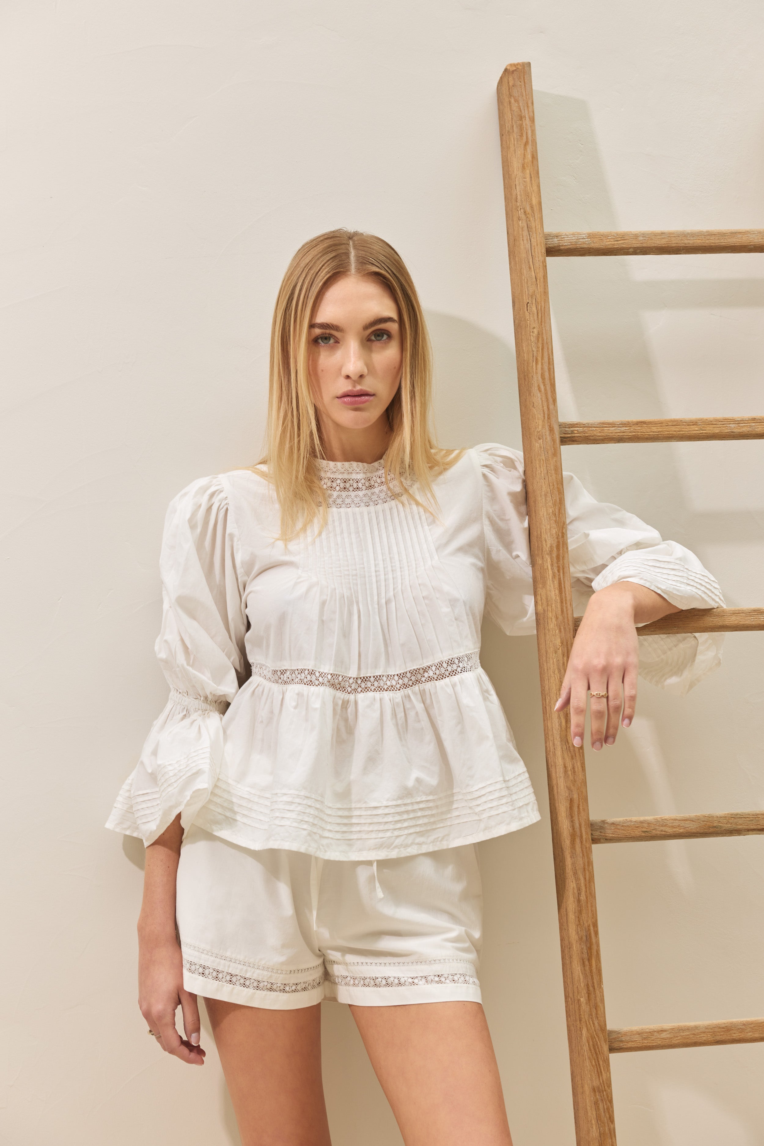 Aérienne et pleine de grâce, Le Jodelle, c'est l'adorable blouse peplum brodée qui fera chavirer votre coeur. Confectionnée dans un coton et soie aérien et doté de merveilleuses manches ballons volantées qui s'animeront gracieusement au gré de vos pas, Le Jodelle, c'est toute la finesse d'un merveilleux travail de broderies et jeu d'inserts en dentelle, témoin de ce savoir-faire d'exception unique que nous sommes allées chercher en Inde auprès de notre atelier. Avec son col légèrement montant tout en dentelle pour une touche plus couture et moderne, Le Jodelle est une pièce coup de coeur qui vous chérirez longtemps.