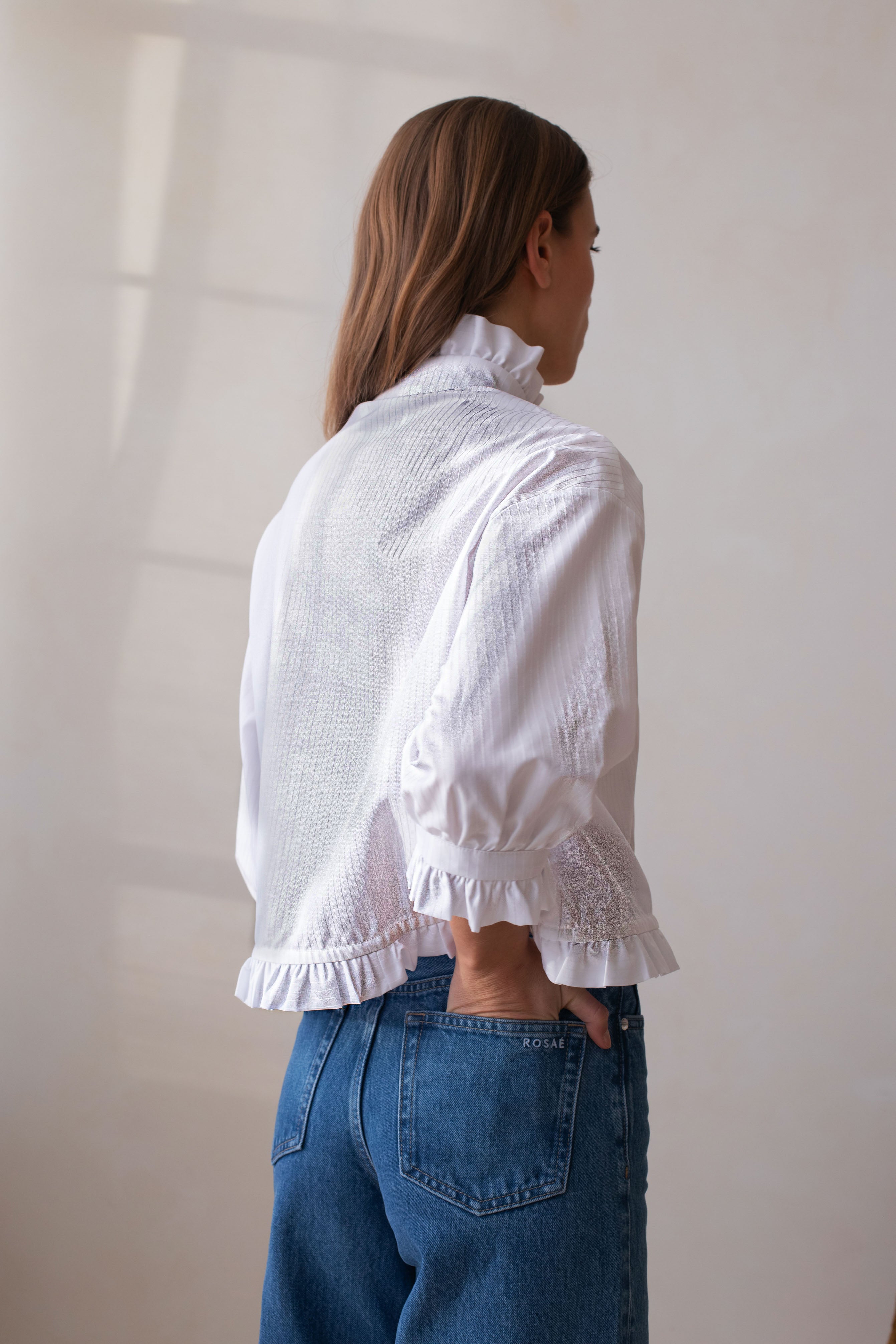 La version blanche a été confectionnée en Roumanie, où nous collaborons avec un magnifique atelier de haut niveau, certifié GOTS et membre de la communauté AMFORI BSCI, qui garantit un haut niveau de responsabilité économique et sociale.