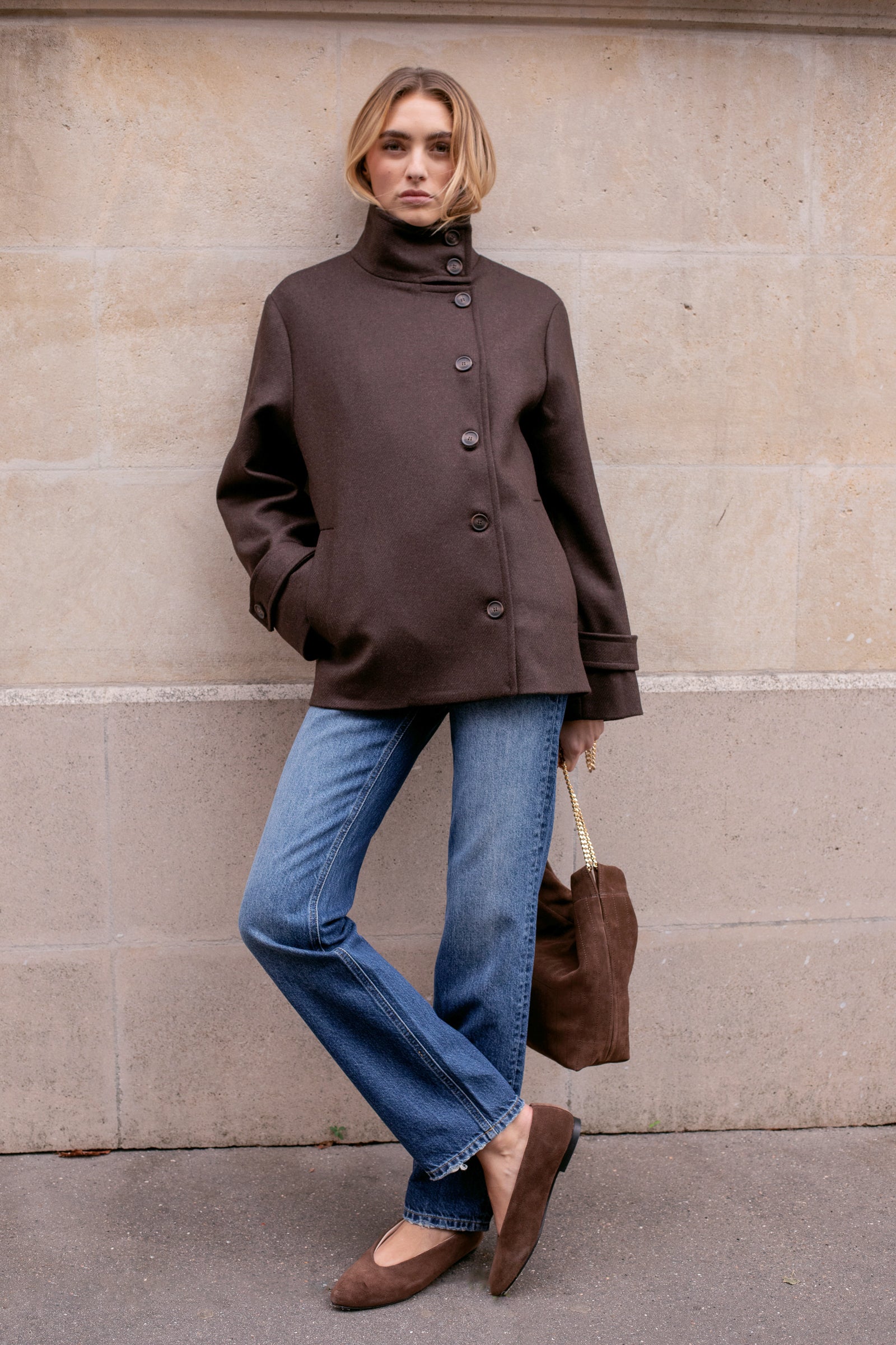 Avec son col montant et sa rangée asymétrique de boutons corne signature, Le Racine, c'est le manteau court ultra désirable. Avec sa silhouette légèrement boxy et ses lignes impeccables, Le Racine est aussi chaud que dégaine et sculptural. En résumé: c'est le it-coat de la saison.
