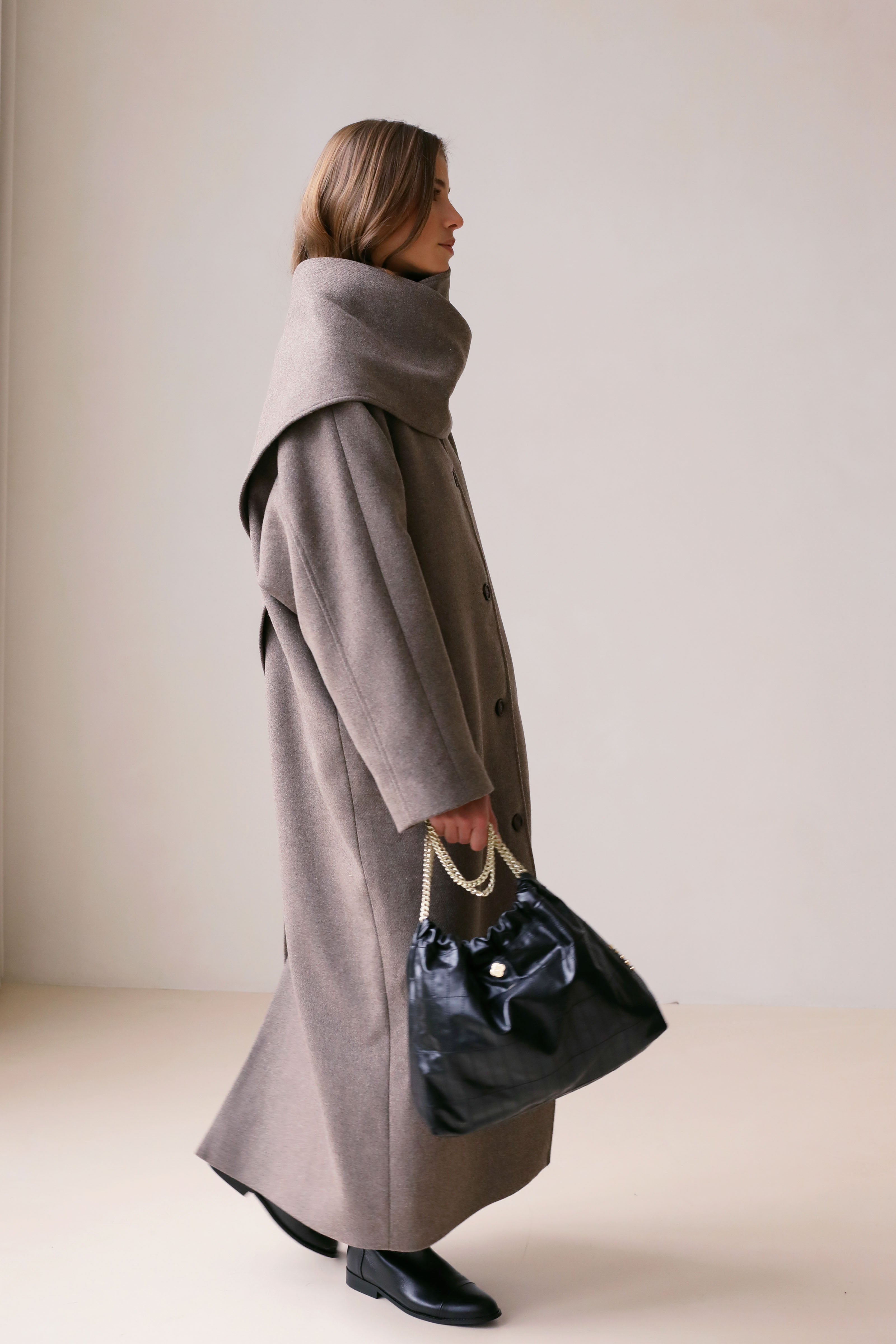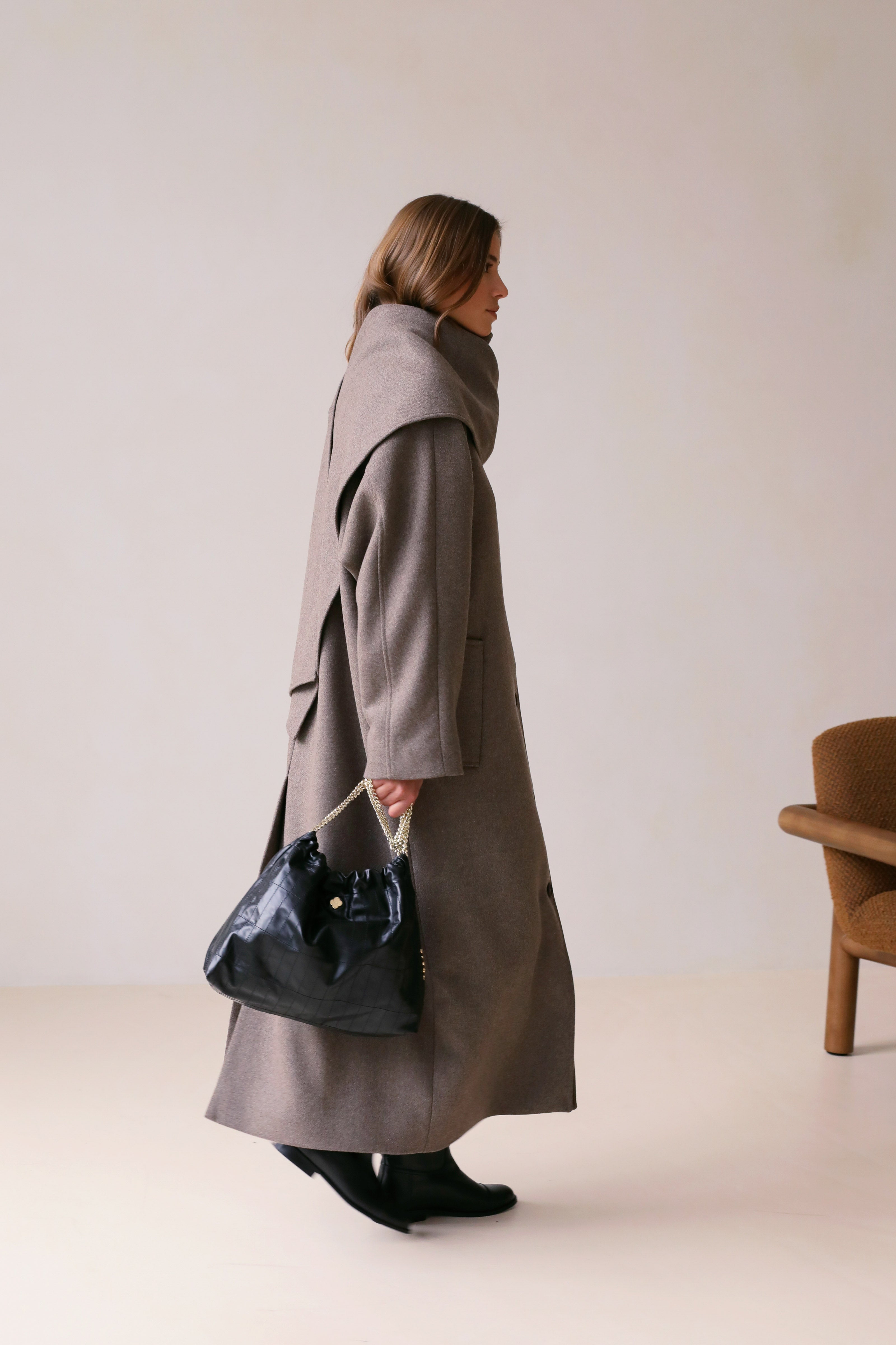 Pour une silhouette ultra chic et sculpturale, associez l'écharpe Le Sacha au manteau Le Spielberg assorti.