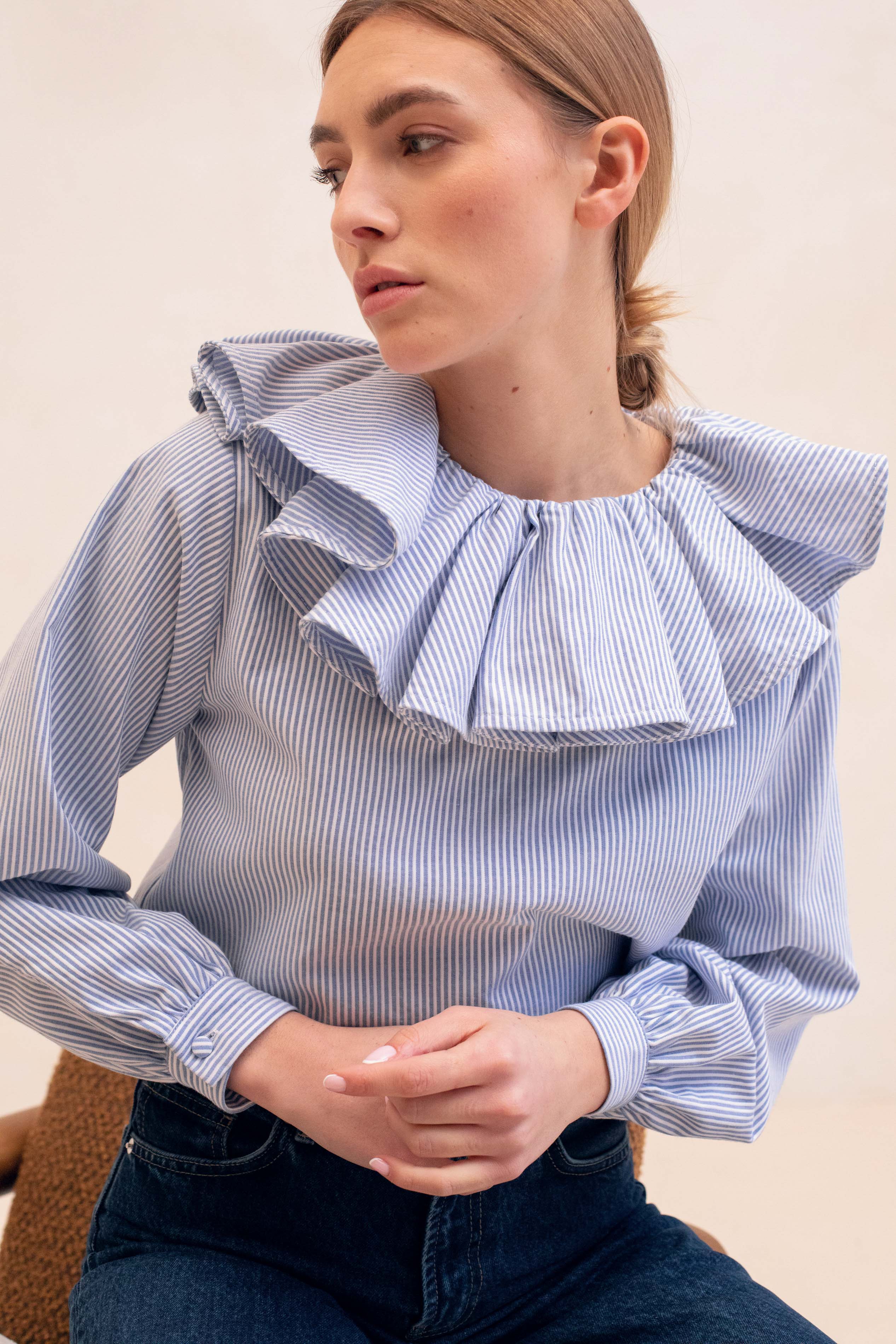 Le Ségur, c'est la blouse indispensable pour tous vos looks preppy. Associez-la à un jean, un blazer oversized et des mocassins pour un outfit impeccable. Vous pouvez aussi la porter sous une jolie maille, en faisant ressortir le col pour un look tout en superposition trop chou.