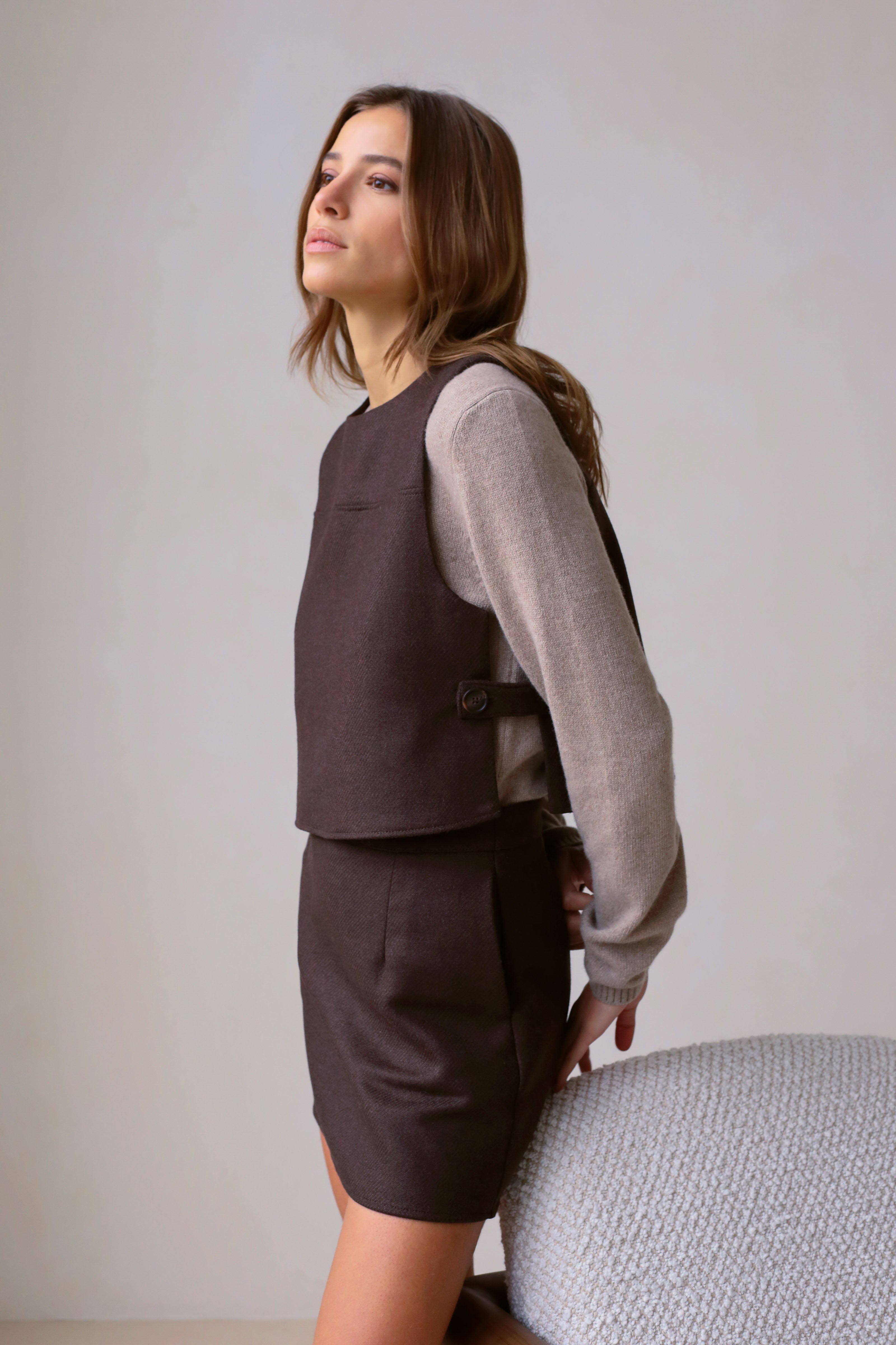 Intemporel revisité, Le Voltaire réinterprète les codes de la mini-jupe trapèze. Confectionnée dans de luxueux lainages italiens, la jupe Le Voltaire, c'est la silhouette impeccable qu'on cherche toutes, tandis que ses plis soigneusement placés et ses coutures contrastantes lui donnent une touche plus couture empreinte de modernité. Un essentiel à porter seul ou en ensemble avec le top Le Verlaine assorti.