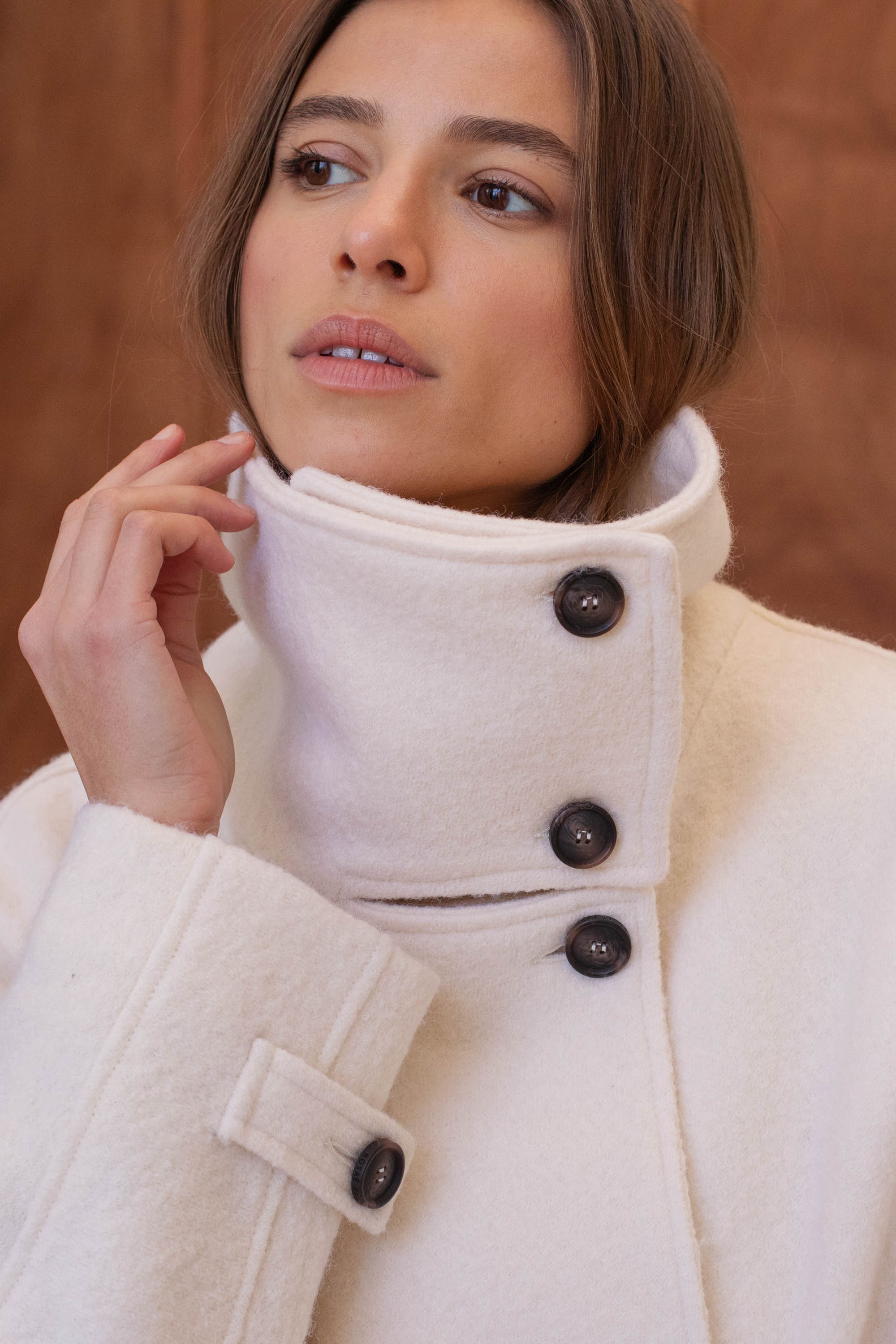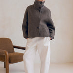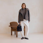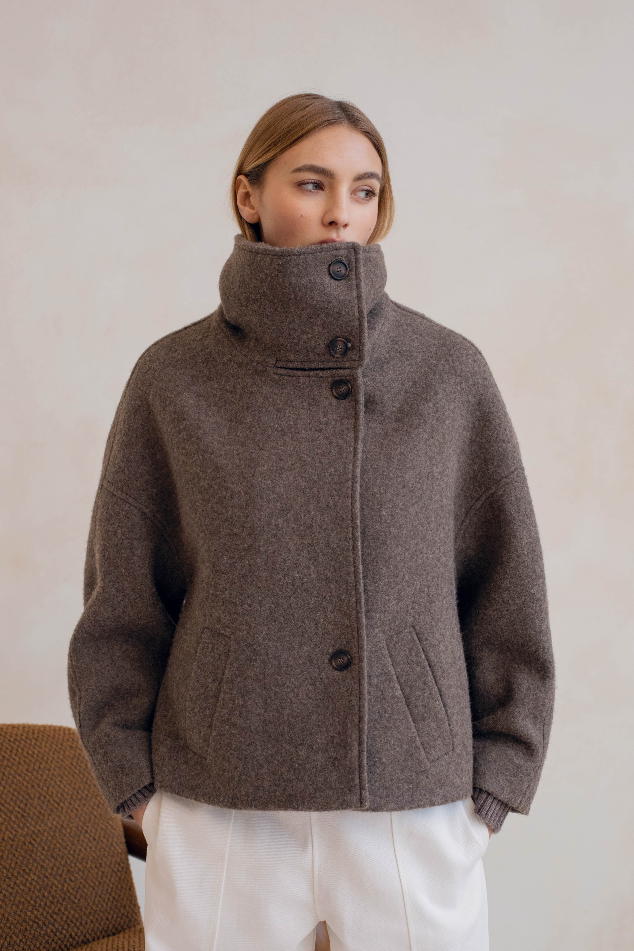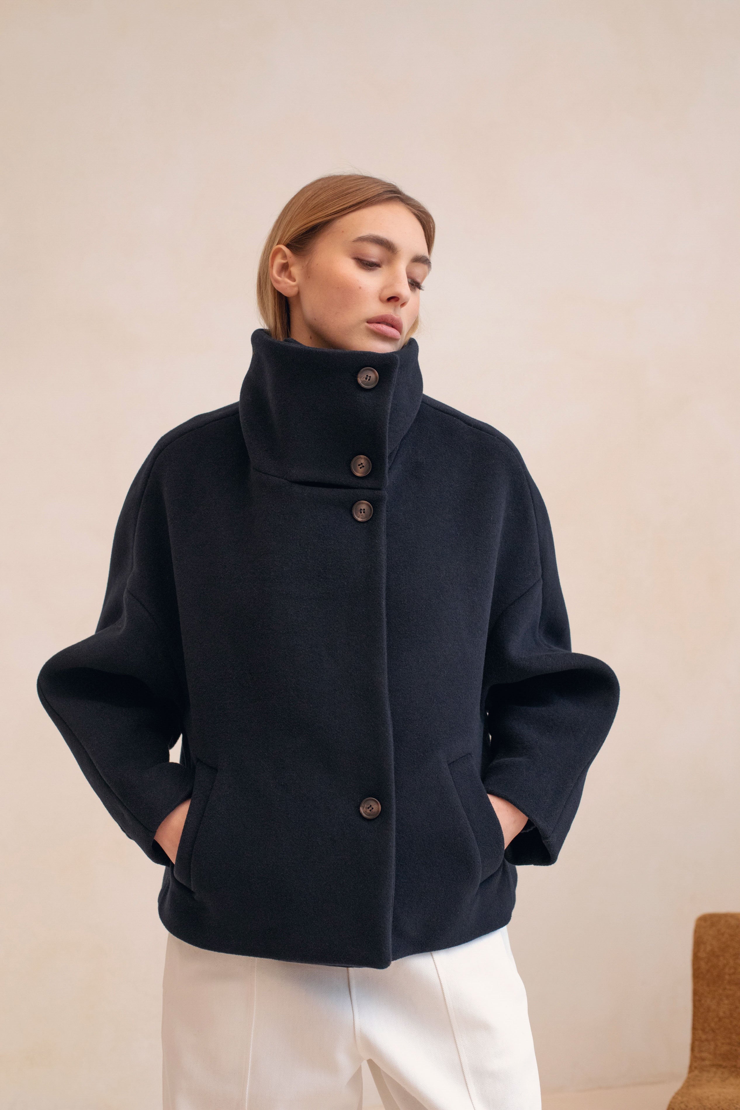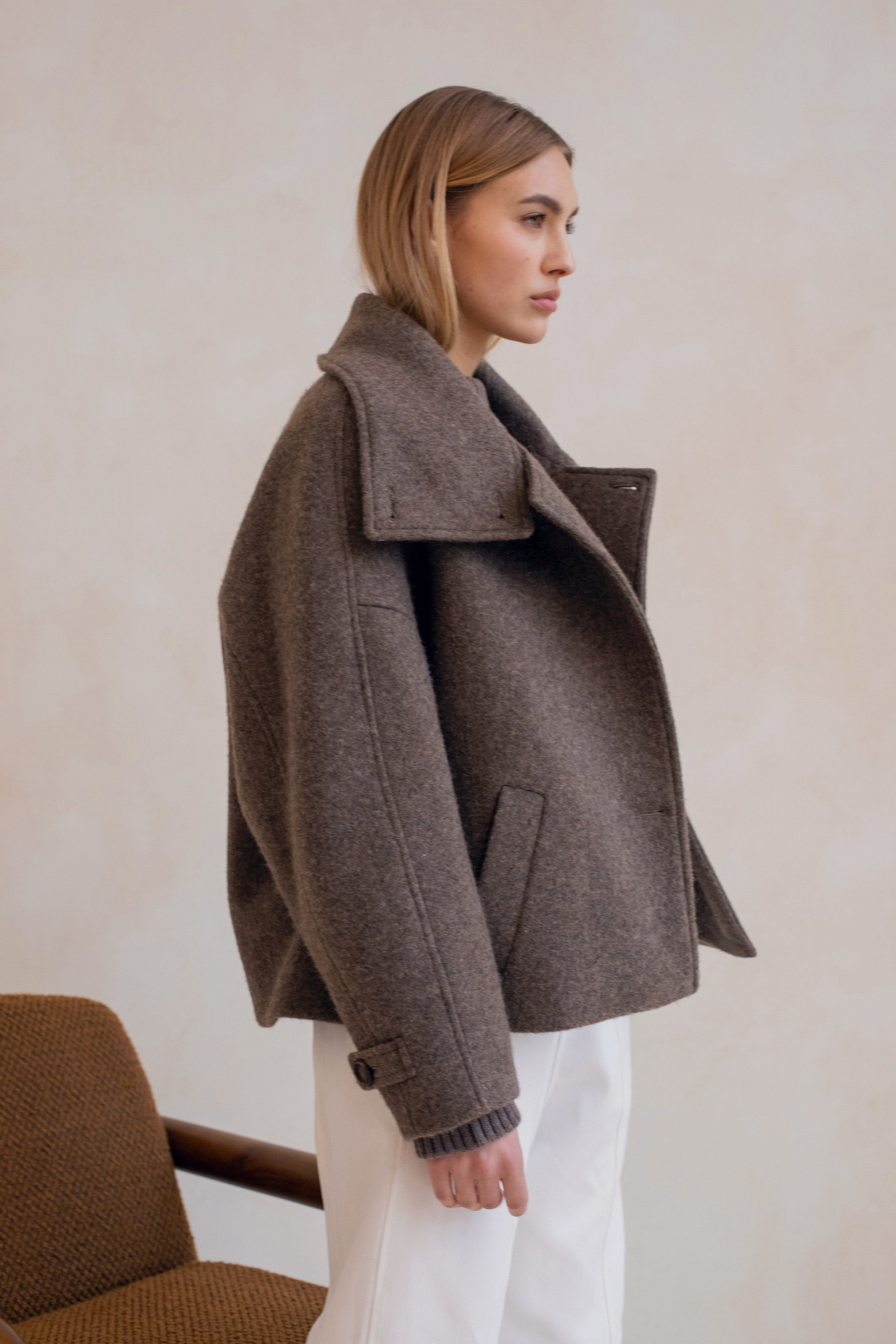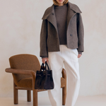 Quand l'architectural rencontre la douceur, cela donne le manteau le plus désirable de la saison, Le Winslet. Coupe subtilement oversized et légèrement trapèze pour une allure résolument moderne, Le Winslet dessine une silhouette hyper couture alliant effortless chic et confort. Son col montant boutonné de façon asymétrique apporte une signature graphique et contemporaine, jouant sur les lignes et les volumes avec justesse. Confectionné dans une laine aussi douce que luxueuse, Le Winslet vous enveloppera sans alourdir, affirmant un style minimaliste et incroyablement chic.
