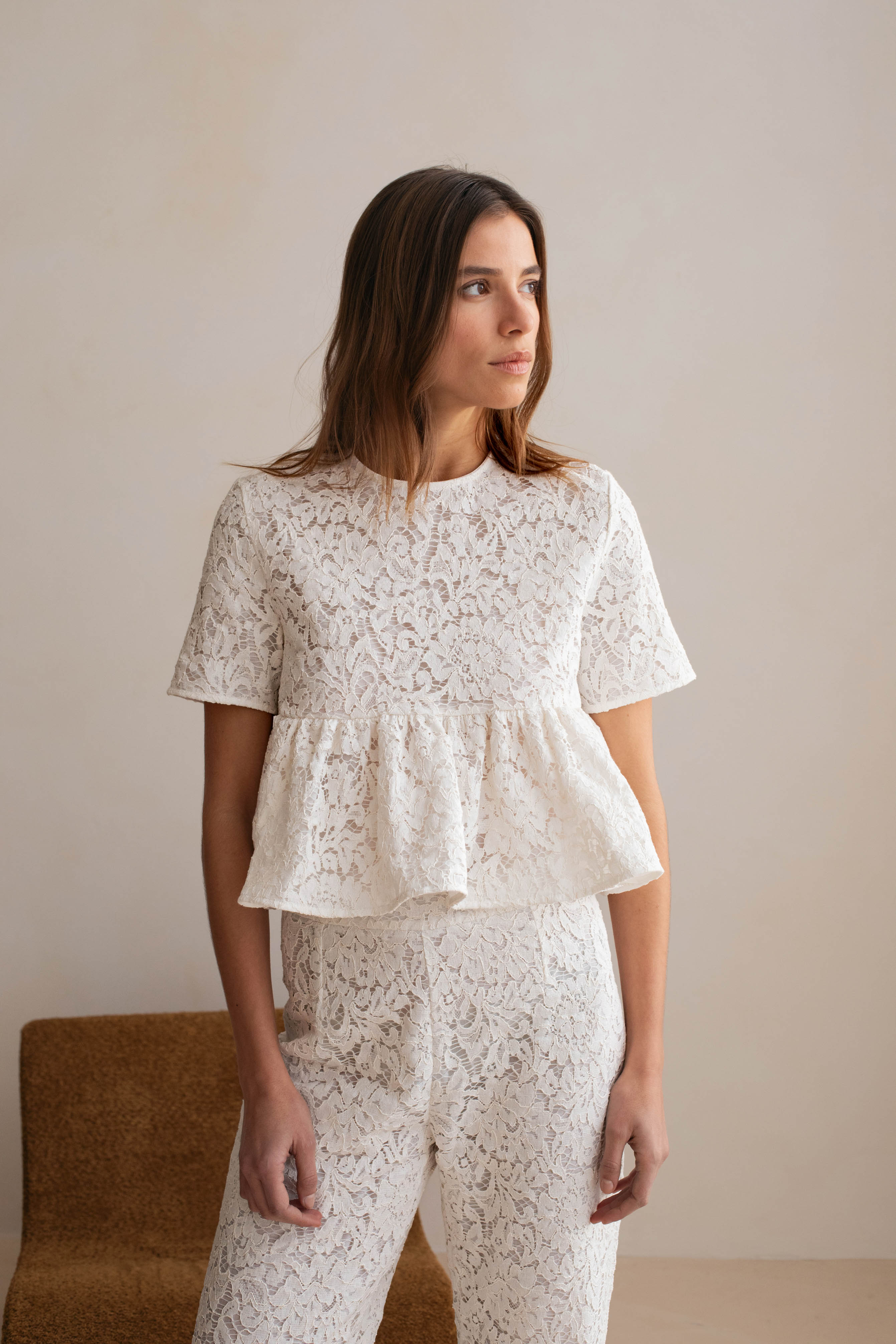 La dentelle, finement travaillée, joue sur la transparence pour révéler juste ce qu’il faut, créant un équilibre parfait entre poésie et style. À porter avec le top Le Louane assorti, pour un ensemble très architectural et définitivement wahou.